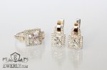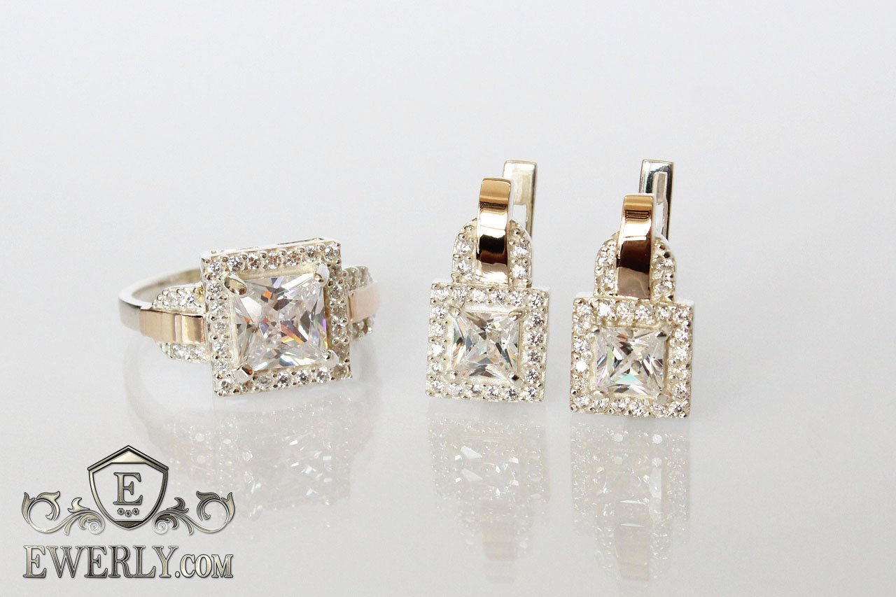 Women's silver earrings and a ring made of sterling silver with gold inserts 375 of test and fianites.