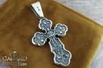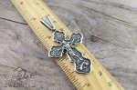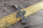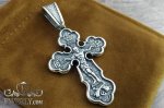 Depicted on the cross: The crucifixion of Christ. Intercession of the Blessed Virgin. The Great Martyr George the Victorious. Big men's orthodox cross of silver with blackening. Length: 4.7 cm