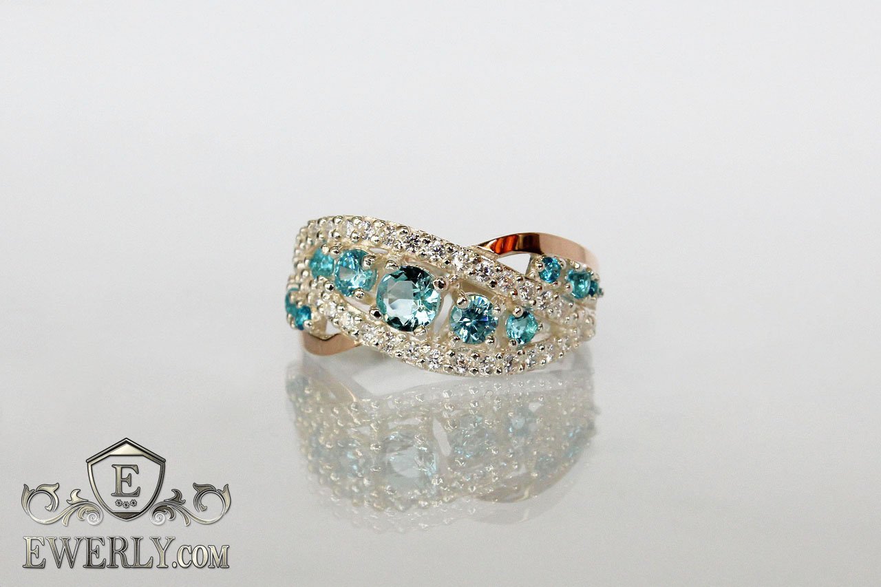 Silver ring made of 925 sterling silver with 9k gold inserts and light blue stones (cubic zirconia) for a girl.