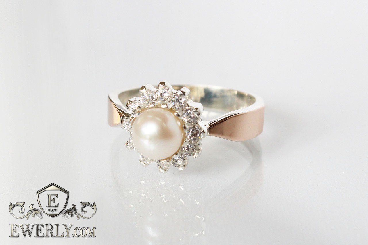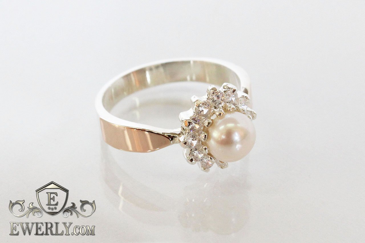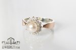 Women's ring made of 925 sterling silver with 9k gold inserts with stones (white cubic zirconia in the center in the form of a pearl).