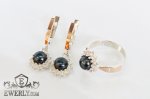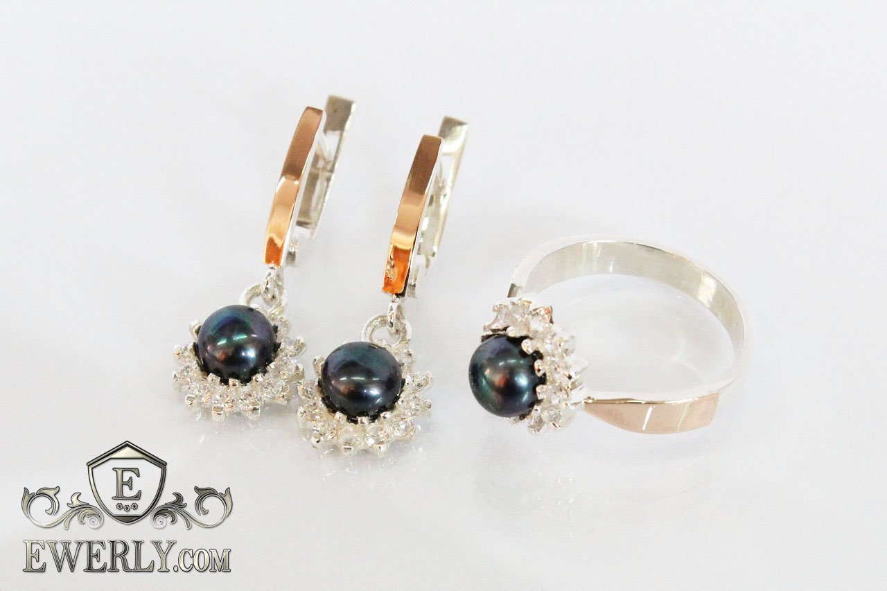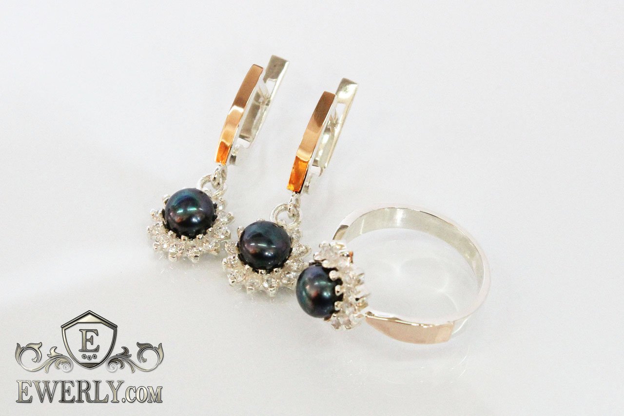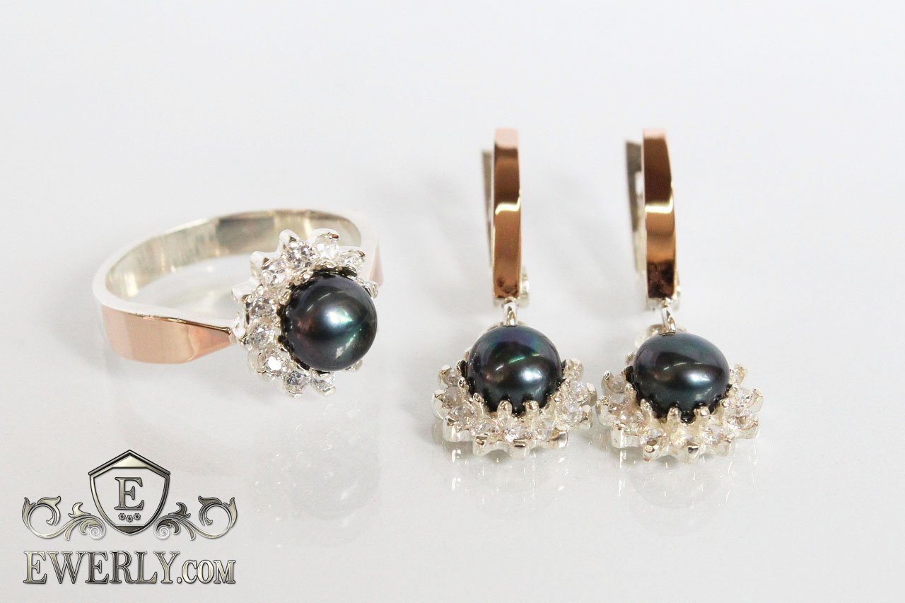 Женский комплект: серебряное кольцо и серьги с искусственным чёрным жемчугом и золотыми вставками. Серебро 925 пробы с золотом 375 пробы с фианитом чёрного цвета