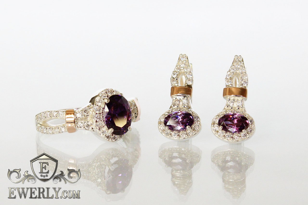 Женский набор: серёжки и кольцо из серебра с золотом и камнями (цвет-аметист)