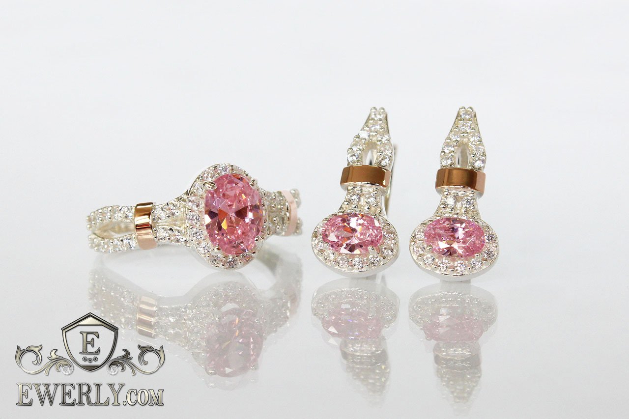 Женский набор: серёжки и кольцо из серебра с золотом и розовыми камнями