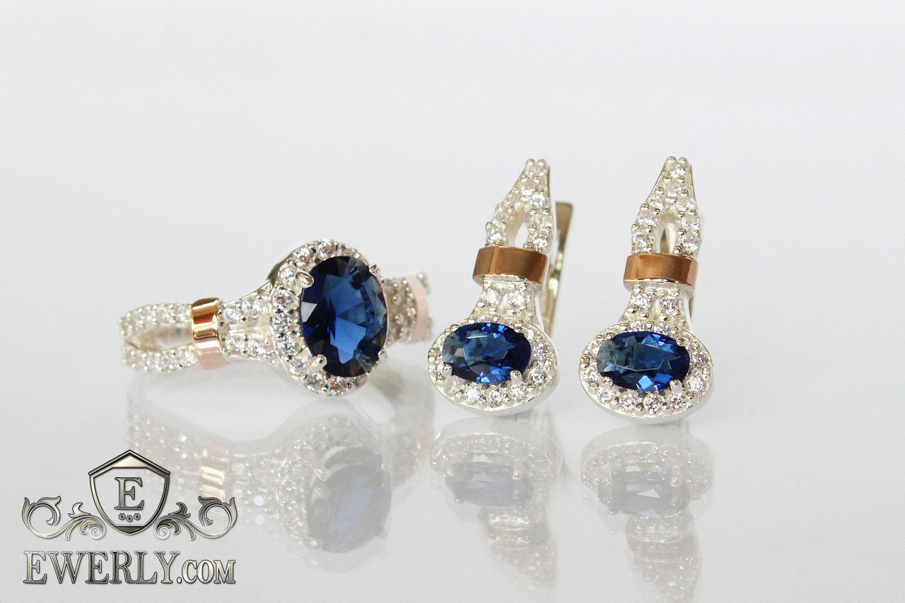Женский набор: серёжки и кольцо из серебра с золотом и синими камнями