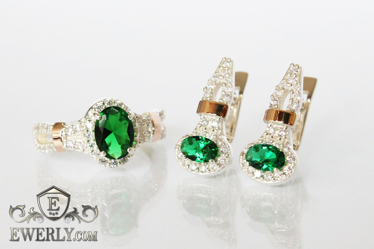 Женский набор: серёжки и кольцо из серебра с золотом и зелёными камнями