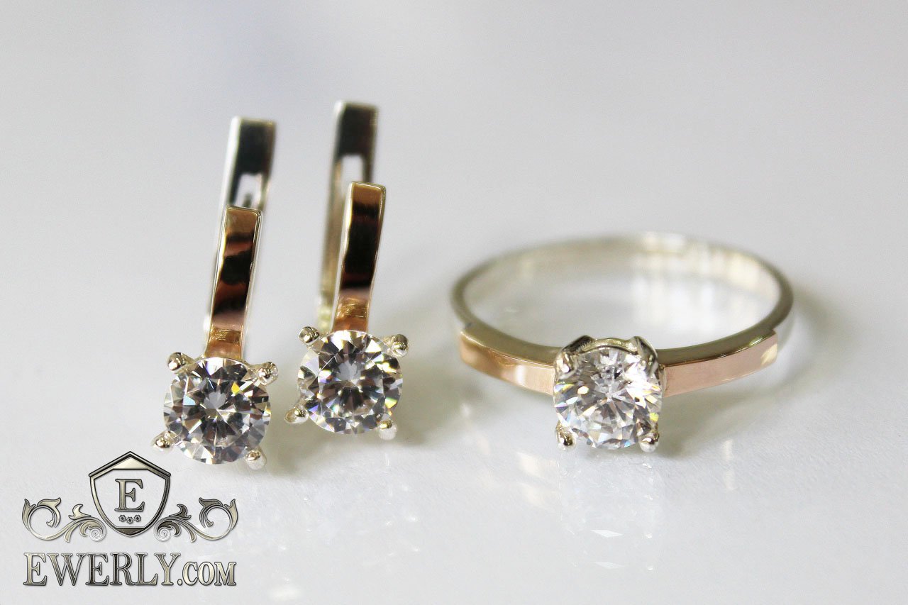 Серебряные серёжки и кольцо с золотом и белыми камнями для девушек