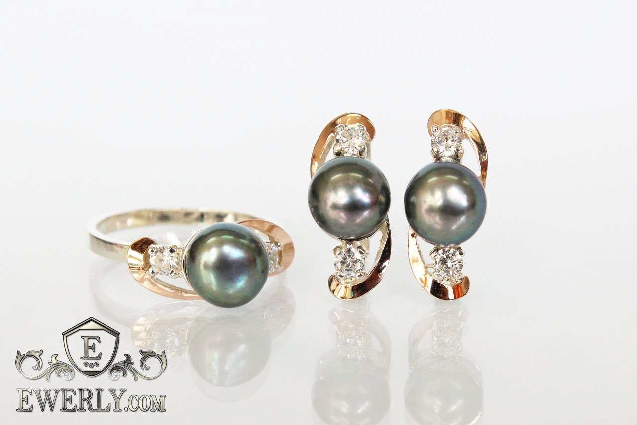 Женский набор: серебряное кольцо и серьги с искусственным жемчугом и золотыми вставками. Серебро 925 пробы с золотом 375 пробы и чёрными фианитами в виде жемчуга.