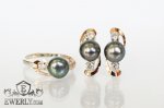 Серебряное кольцо и серьги с чёрными фианитами в виде жемчуга