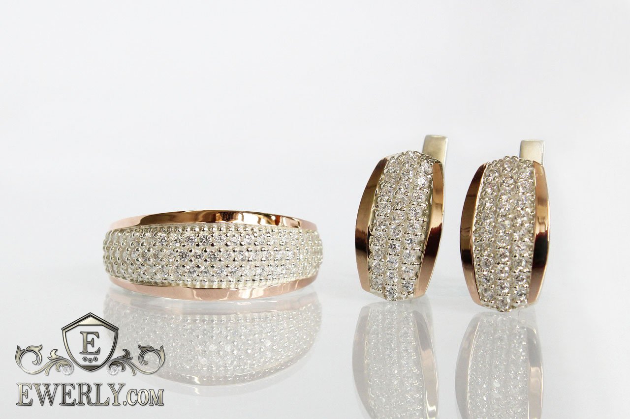 Женский комплект: серёжки и кольцо из серебра с золотом и белыми камнями