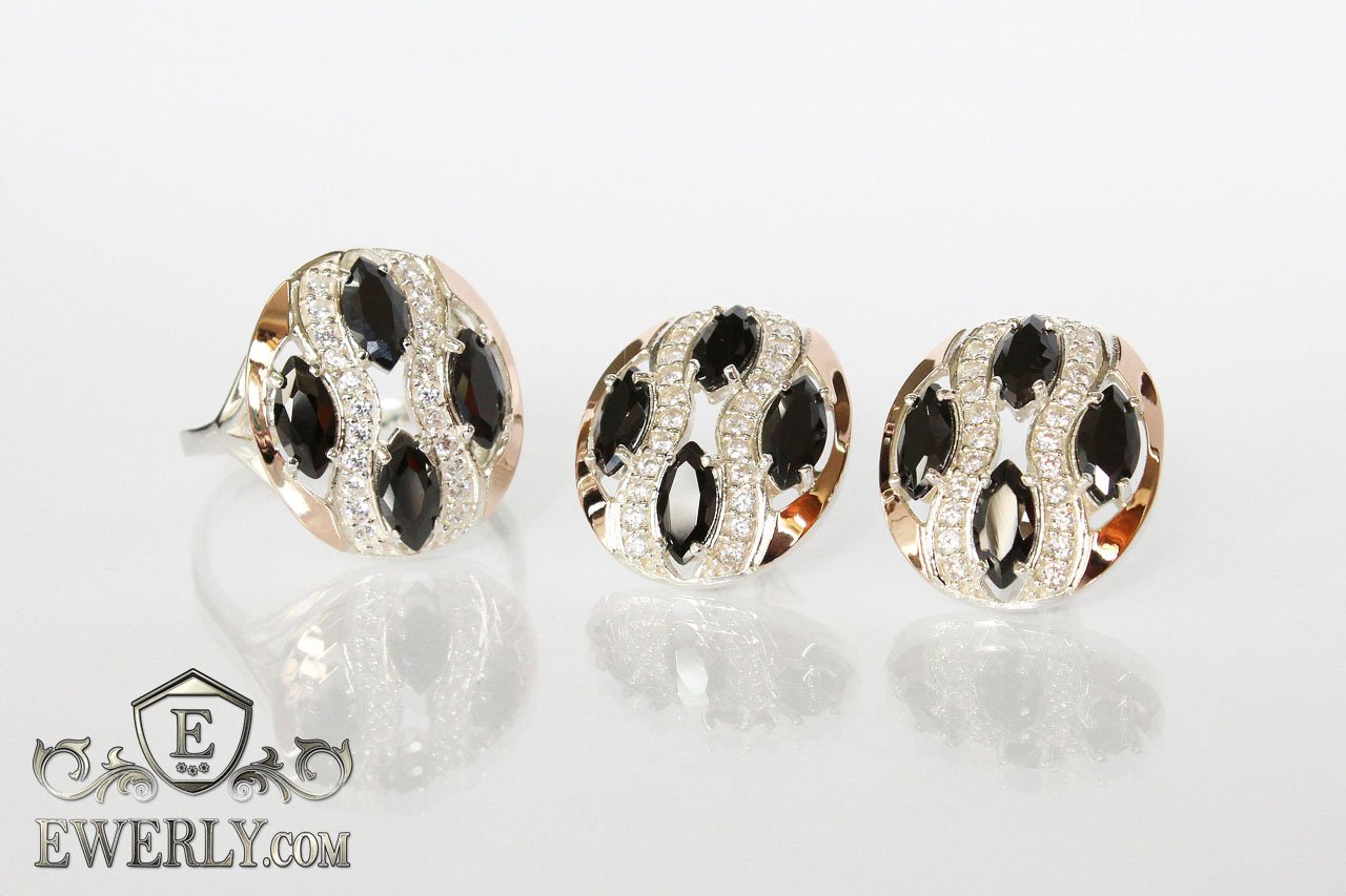 Женский комплект: серьги и кольцо из серебра с золотом и чёрными камнями