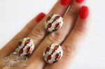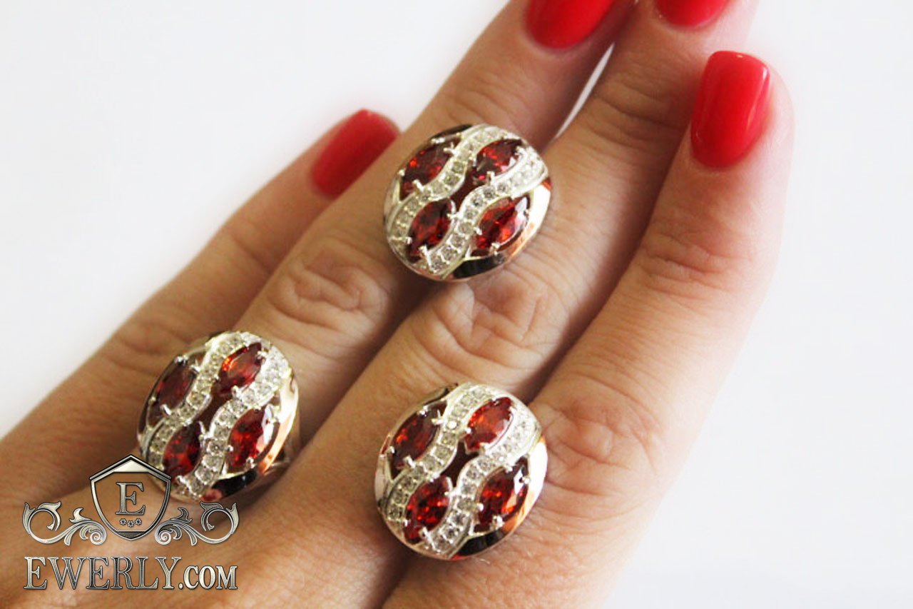 Женский комплект: серьги и кольцо из серебра и красными камнями