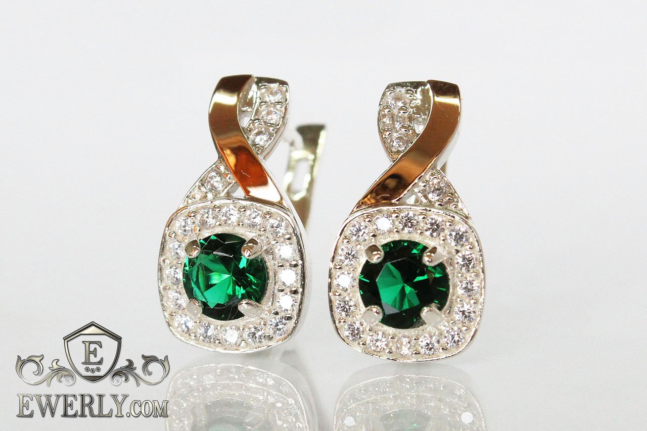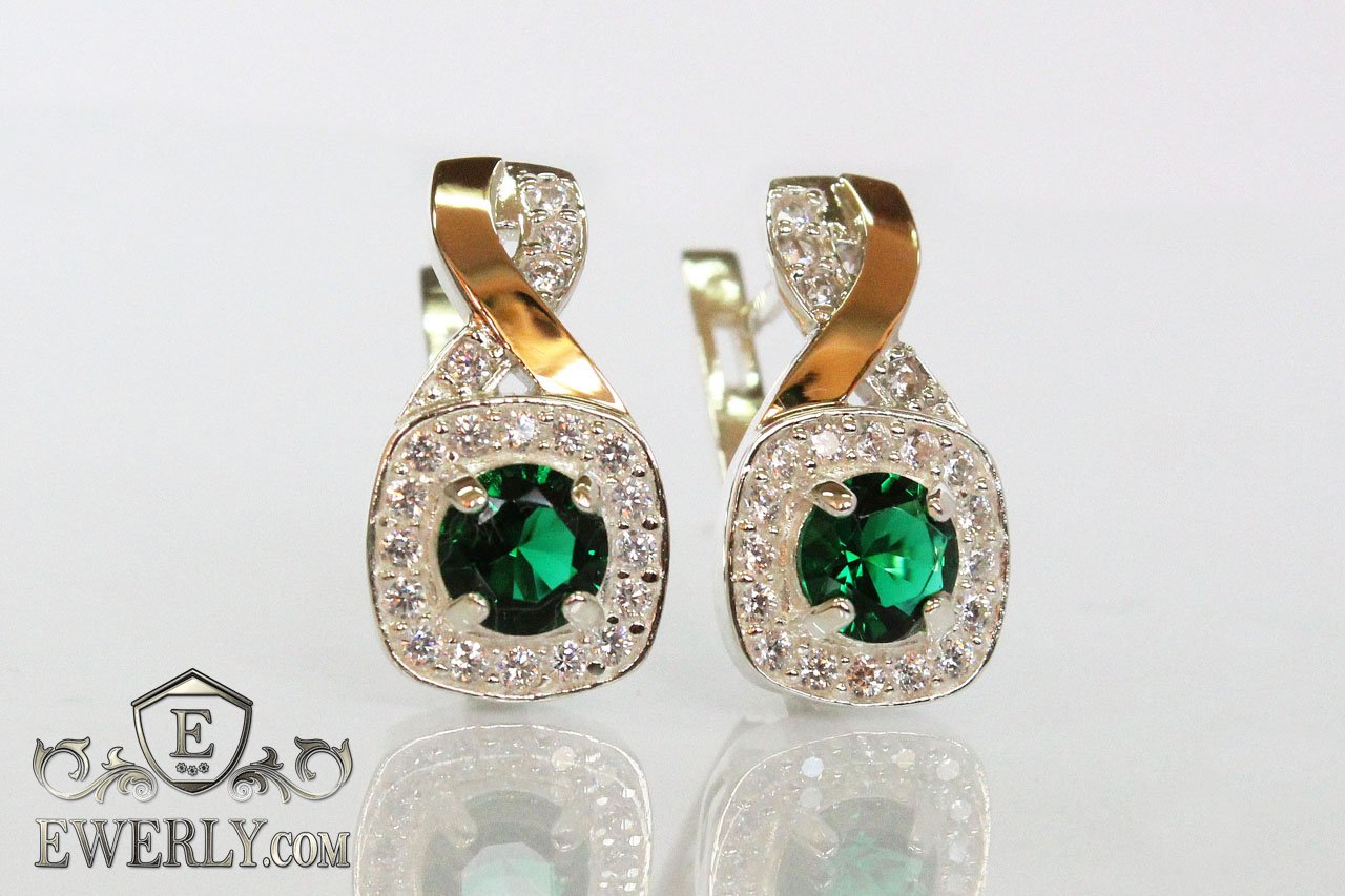 Женские серебряные серёжки 925 пробы с золотыми вставками 375 пробы с зелёными камнями.