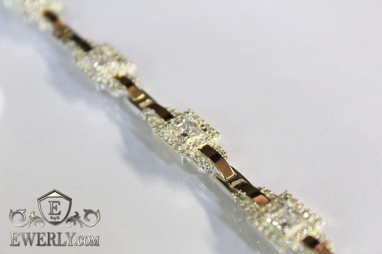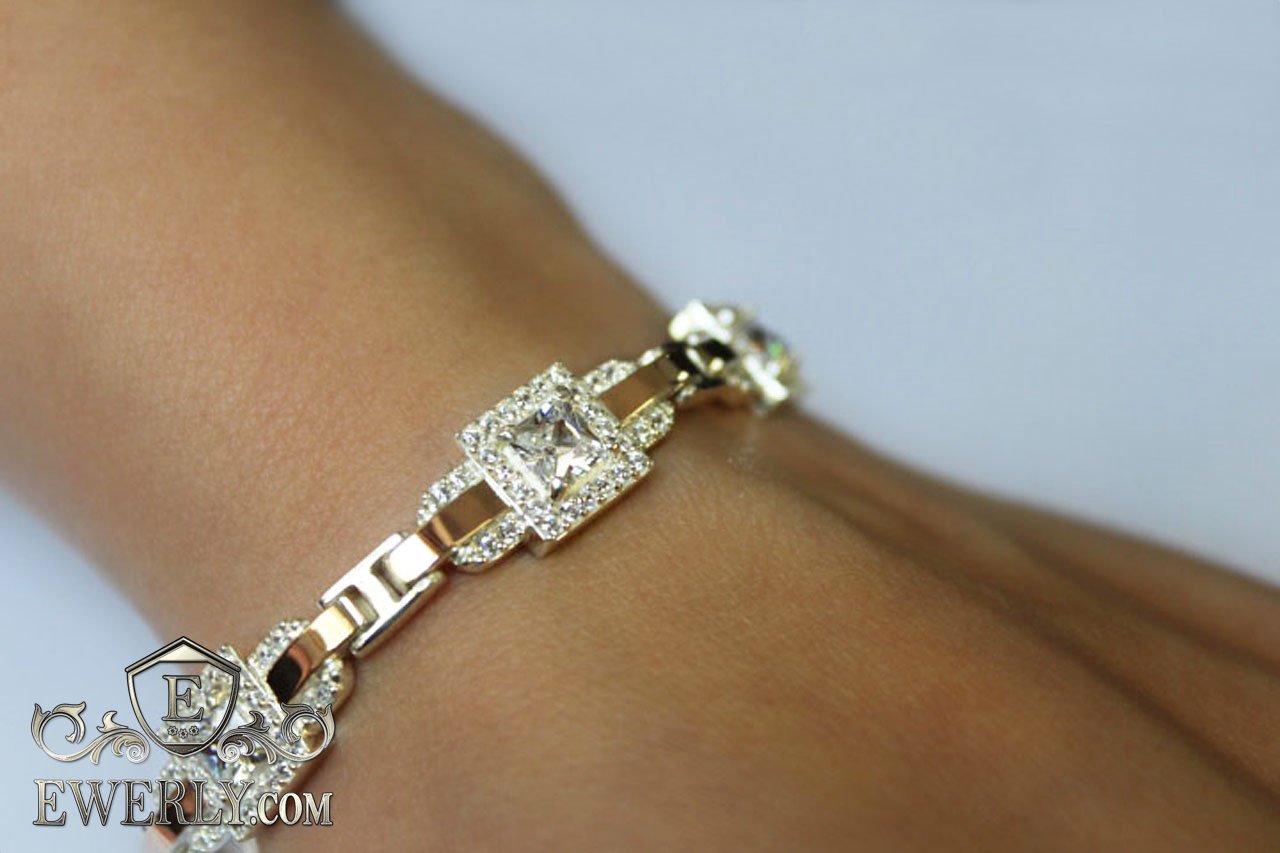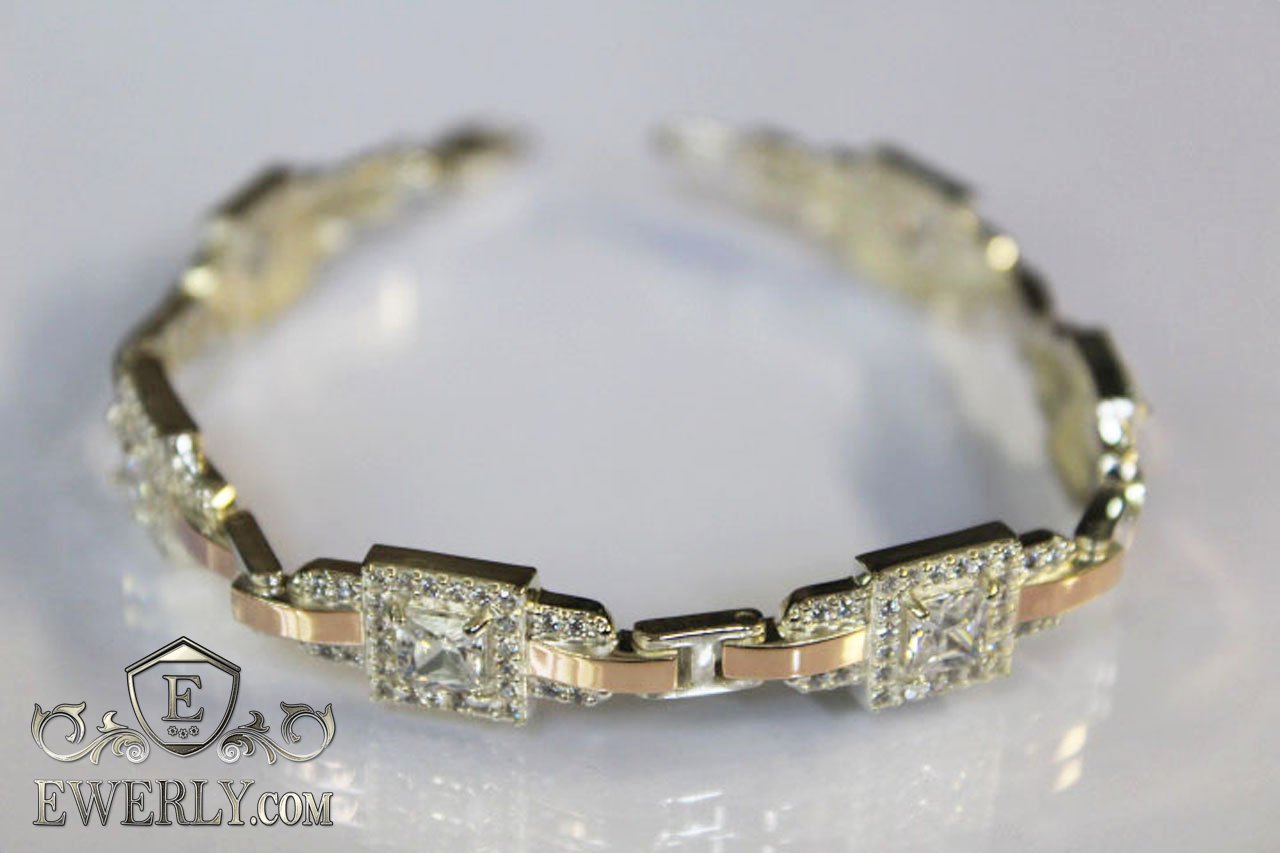 Полновесный браслет. Женский браслет из серебра со вставками золота и камнями (белыми фианитами).