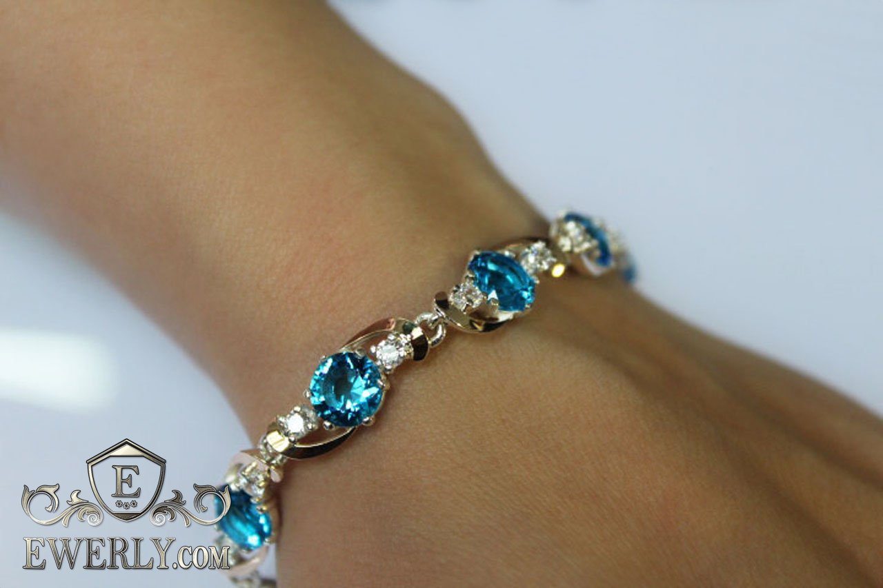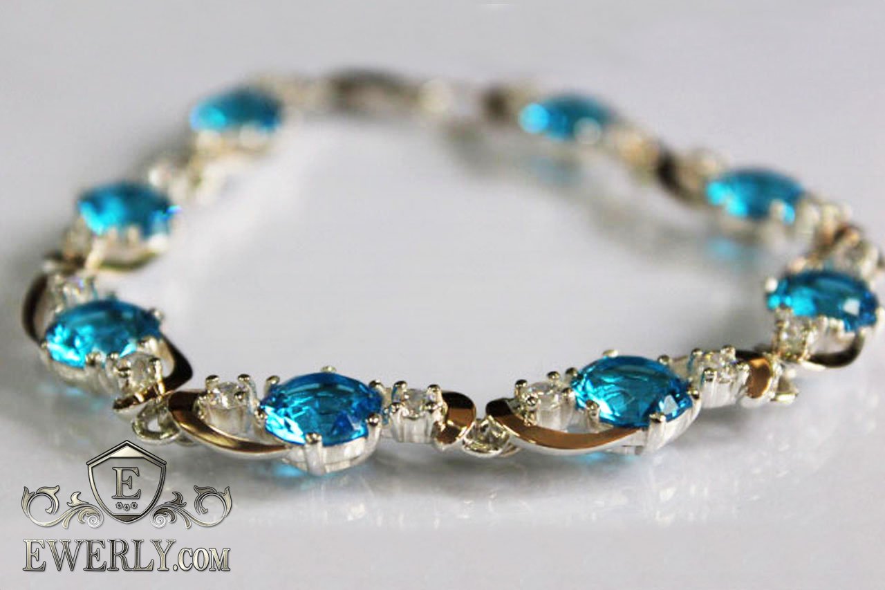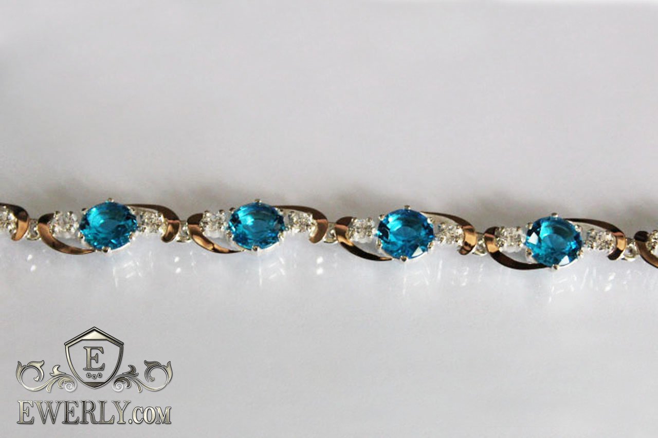 Полновесный браслет. Женский браслет из серебра со вставками золота и камнями (голубыми фианитами).