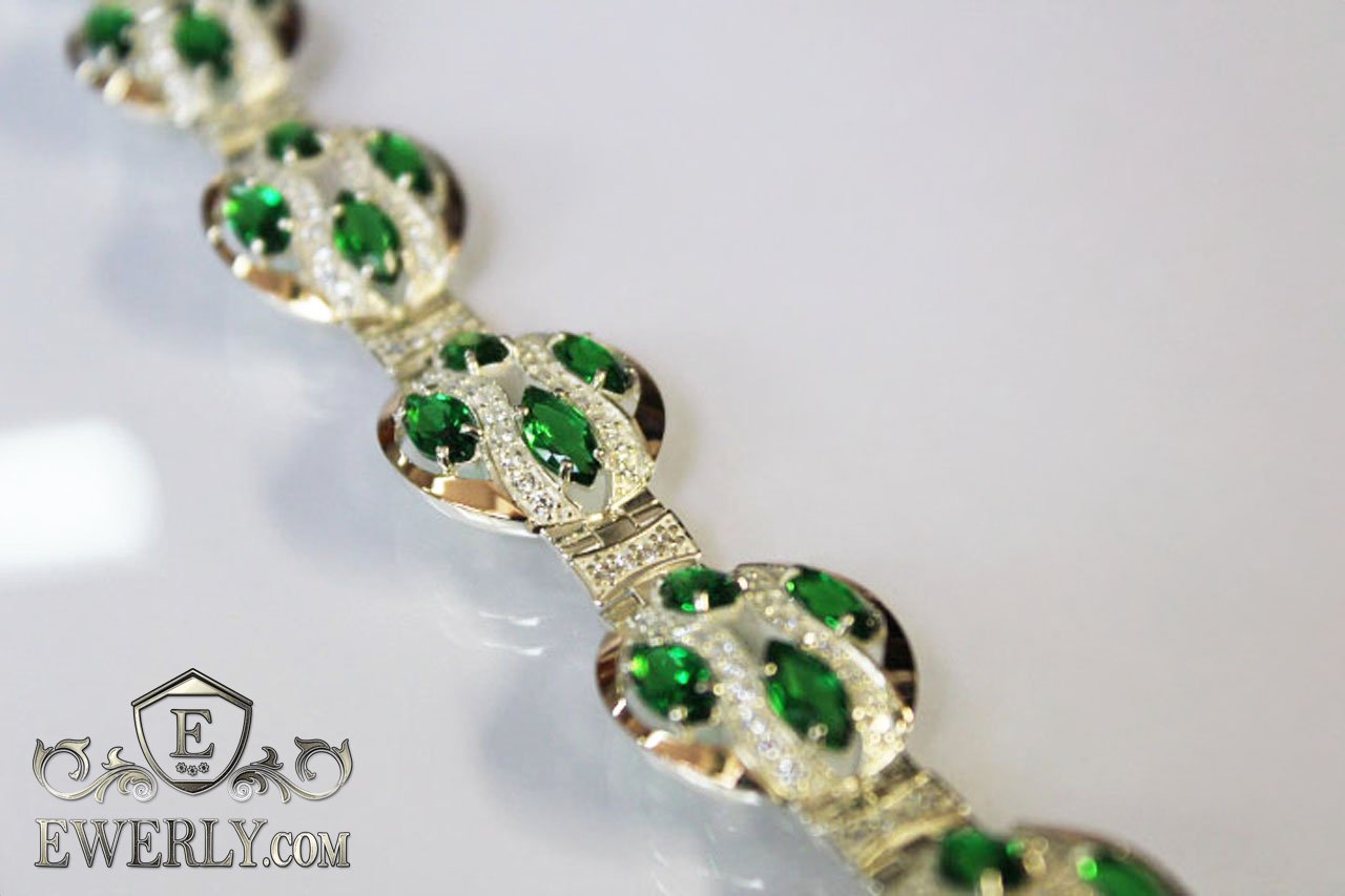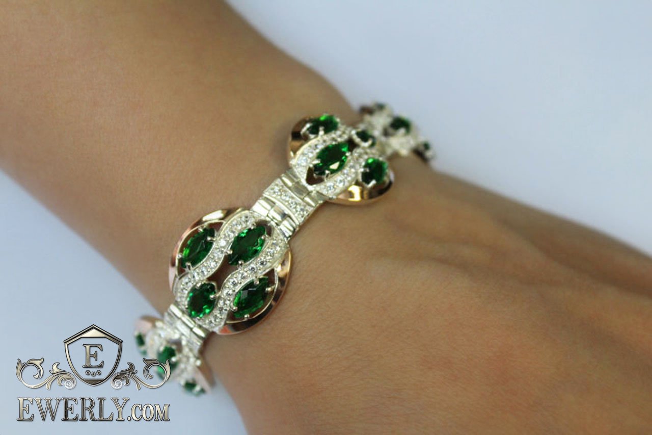 Женский браслет из серебра с зелёными фианитами и вставками золота