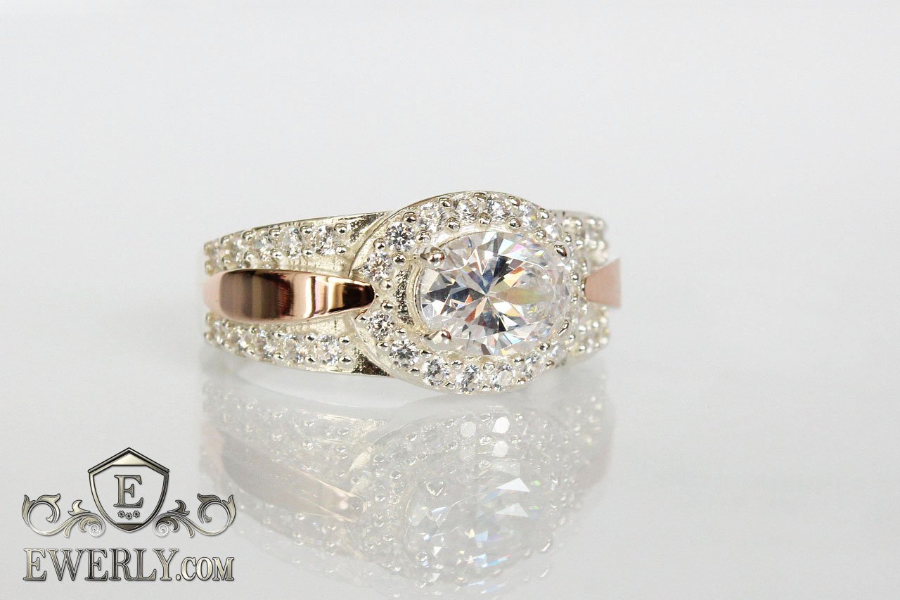Женское серебряное кольцо 925 пробы с золотыми пластинами 375 пробы с овальным белым камнем.