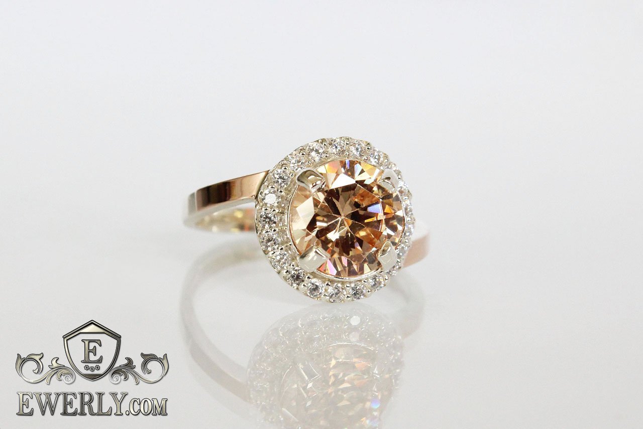 Женское серебряное кольцо 925 пробы с золотыми пластинами 375 пробы с камнем (цвет - шампань).
