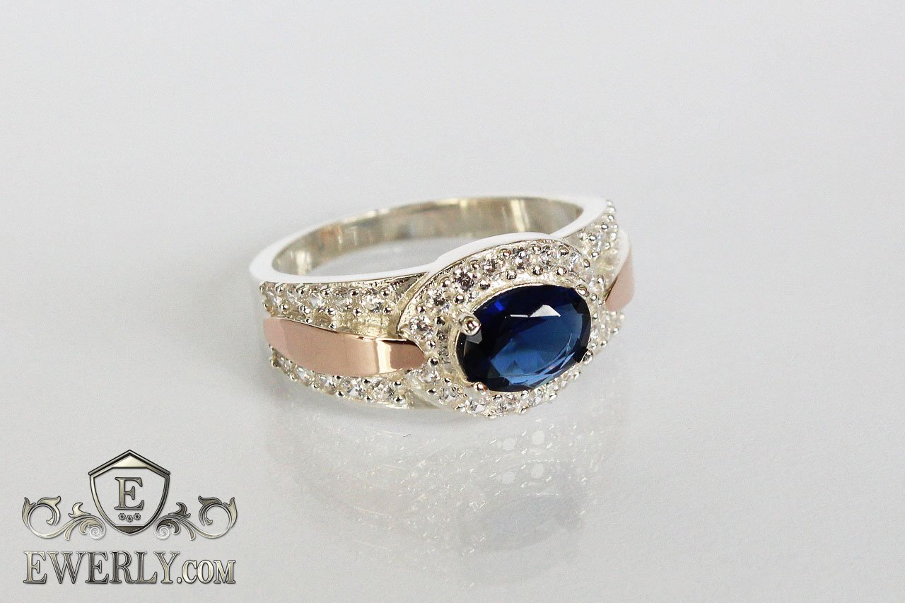 Женское серебряное кольцо 925 пробы с золотыми пластинами 375 пробы с овальным синим камнем.