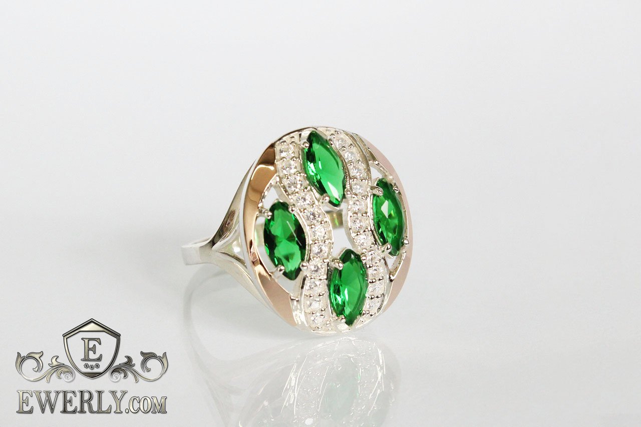 Женское серебряное кольцо 925 пробы с золотыми пластинами 375 пробы с зелёными фианитами.