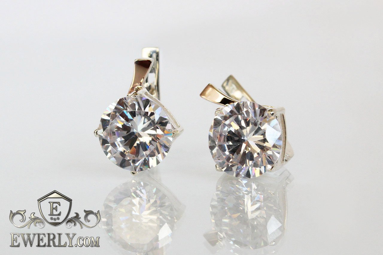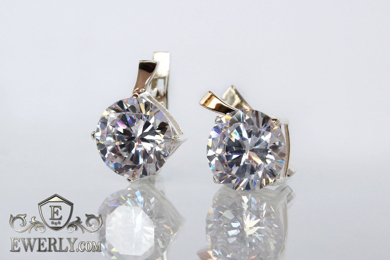 Женские серебряные серёжки с золотыми элементами и белыми камнями - фианитами.