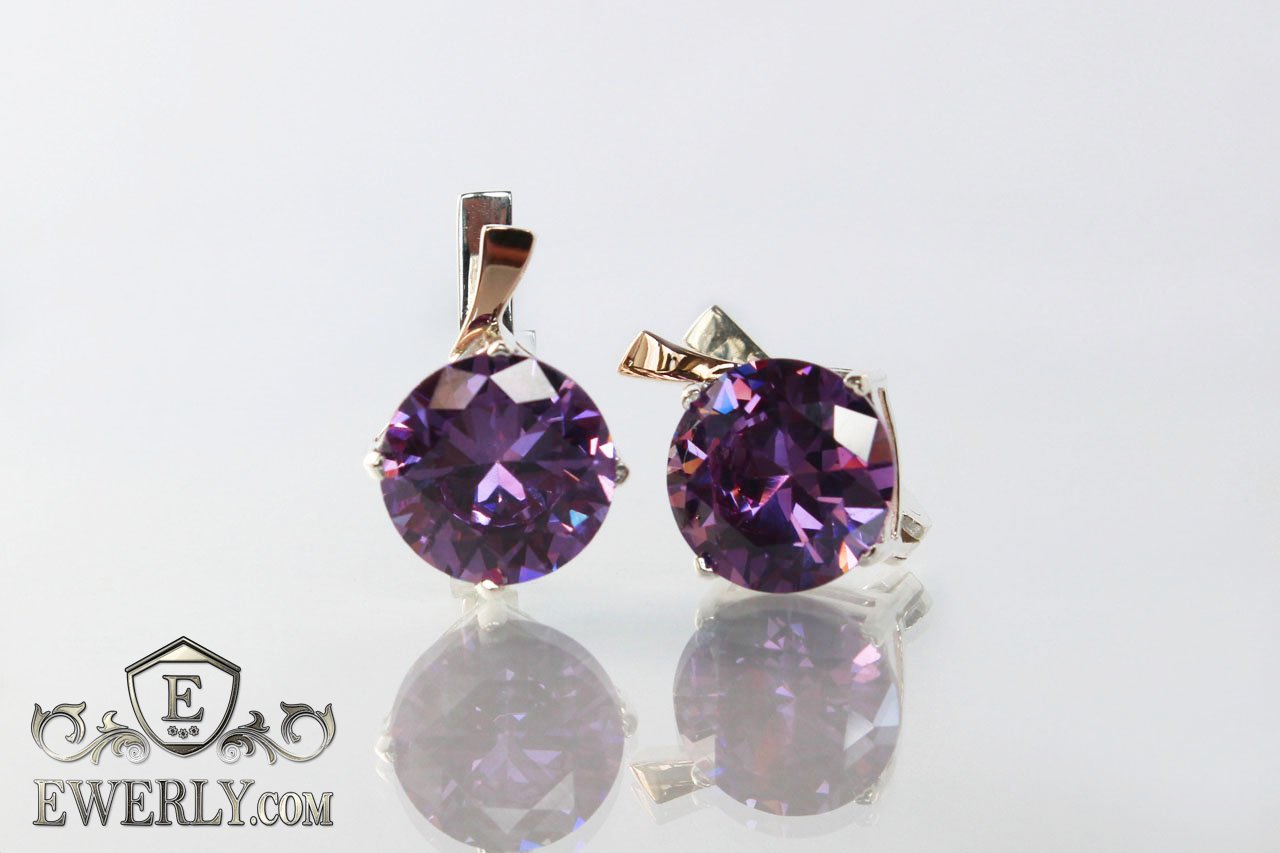 Женские серебряные серёжки с камнями (цвет аметиста) и золотом