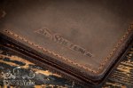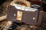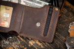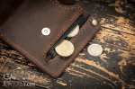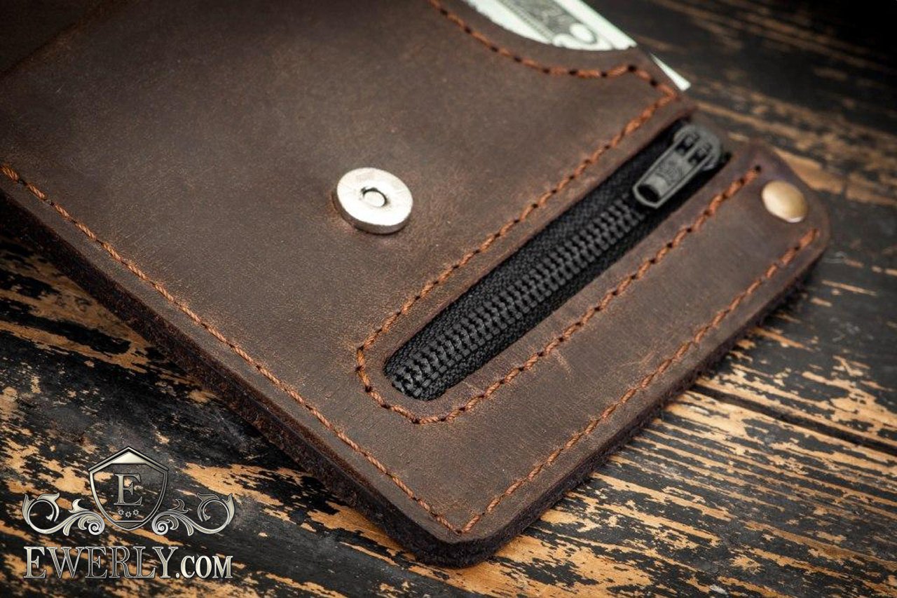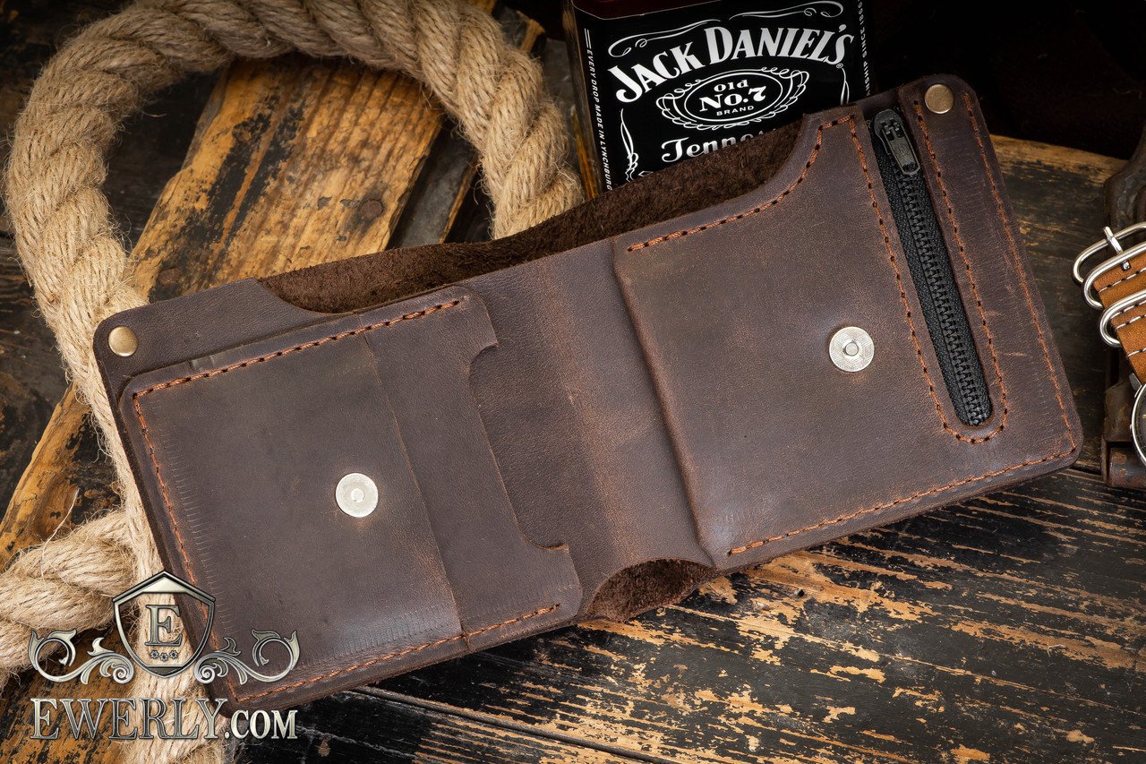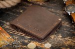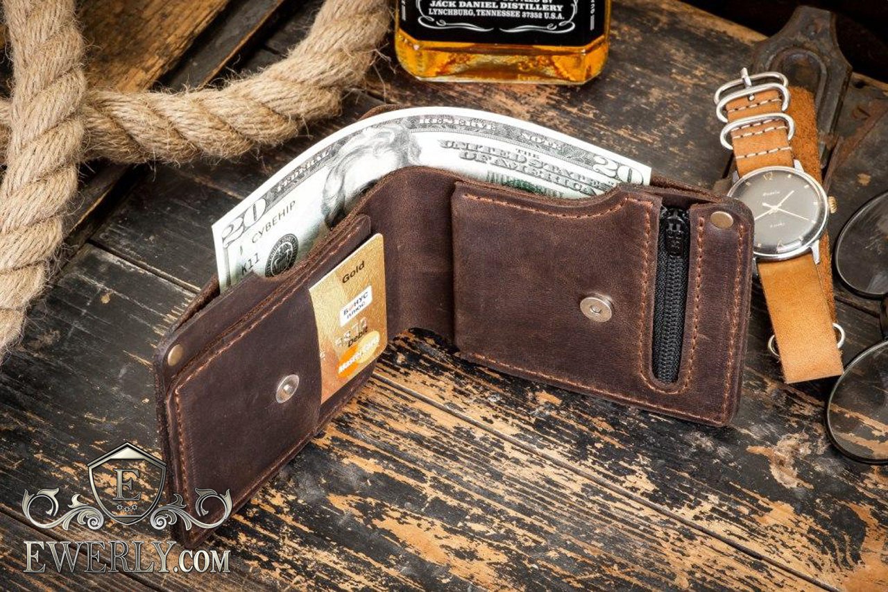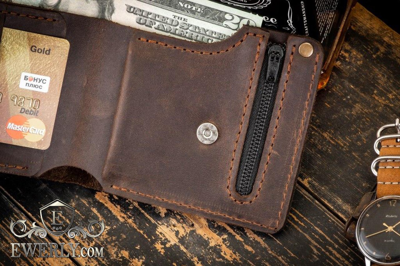 Данная модель кошелька изготовлена из натуральной винтажной кожи коричневого цвета, на которой могут оставаться естественные царапины и потёртости. Любая такая царапина легко затирается рукой. Компактный и является весьма стильным мужским кошельком с интересным дизайном. Имеет один раздел под банковские карты, один раздел с молнией под мелочь, а также один раздел под бумажные деньги купюрами любых номиналов, в том числе самых крупных.