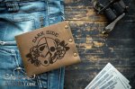 Полностью выполнен из натуральной кожи и металлических заклепок. Эксклюзивное мужское портмоне ручной работы, имеет эффект потёртости и лёгкой небрежности с рисунком и надписью "DARK SIDE", что в переводе на русский значит "Тёмная сторона". Рисунок нанесён на кожу с помощью лазера (лазерная гравировка). Изготовлен в ограниченном выпуске.