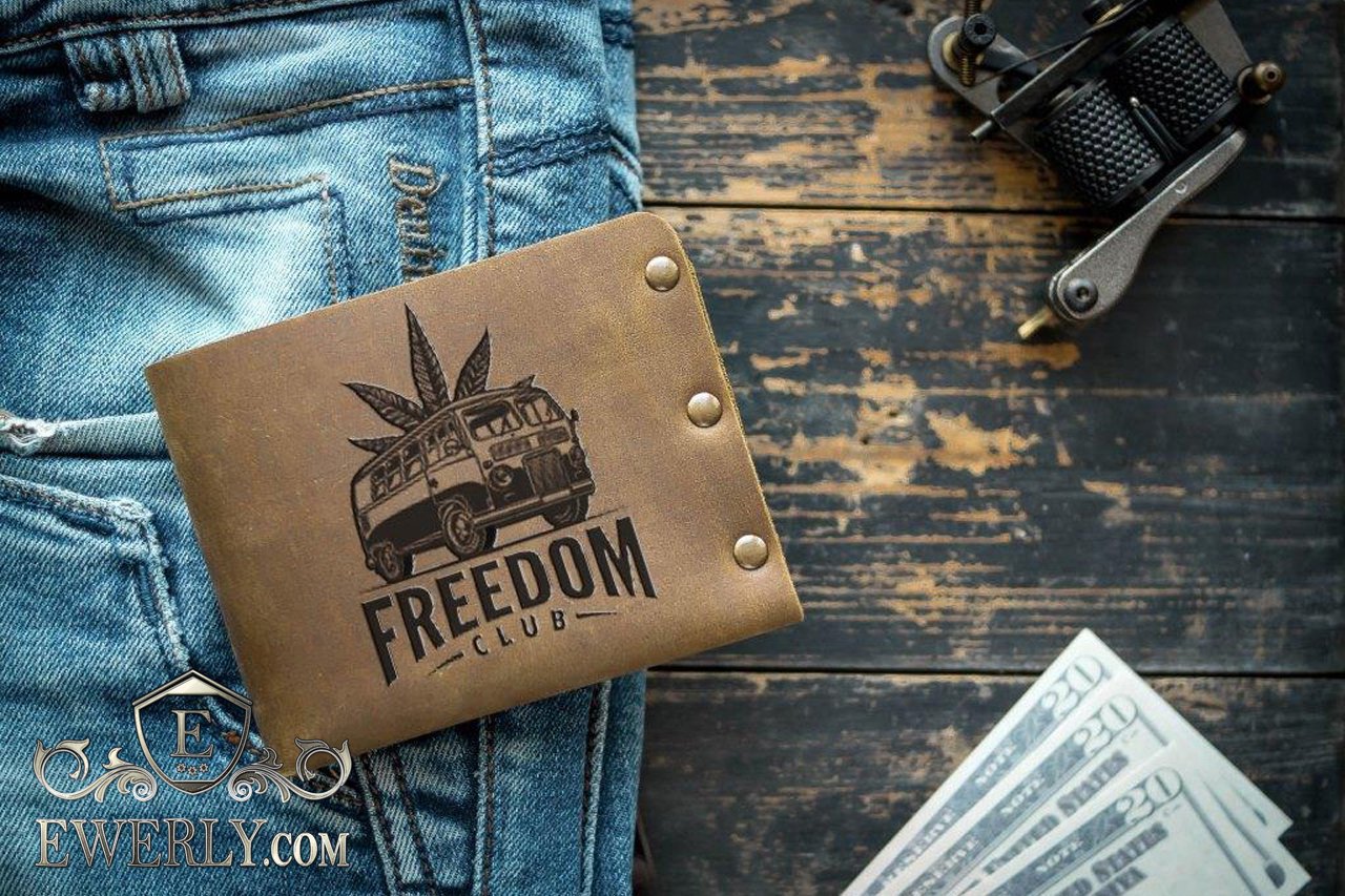 Мужской кожаный кошелек с рисунком и надписью "FREEDOM"