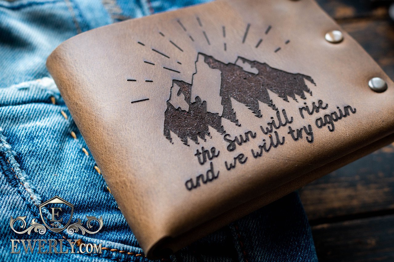 Полностью выполнен из натуральной кожи и металлических заклепок. Эксклюзивное изделие ручной работы с гравировкой текста "the Sun will rise and we will try again", в переводе с английского "Солнце встанет и мы попробуем снова", а также с выгровированным рисунком гор, имеет эффект потёртости и лёгкой небрежности. Рисунок нанесён на кожу с помощью лазера (лазерная гравировка). Изготовлен в ограниченном выпуске.