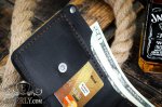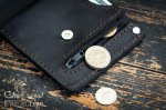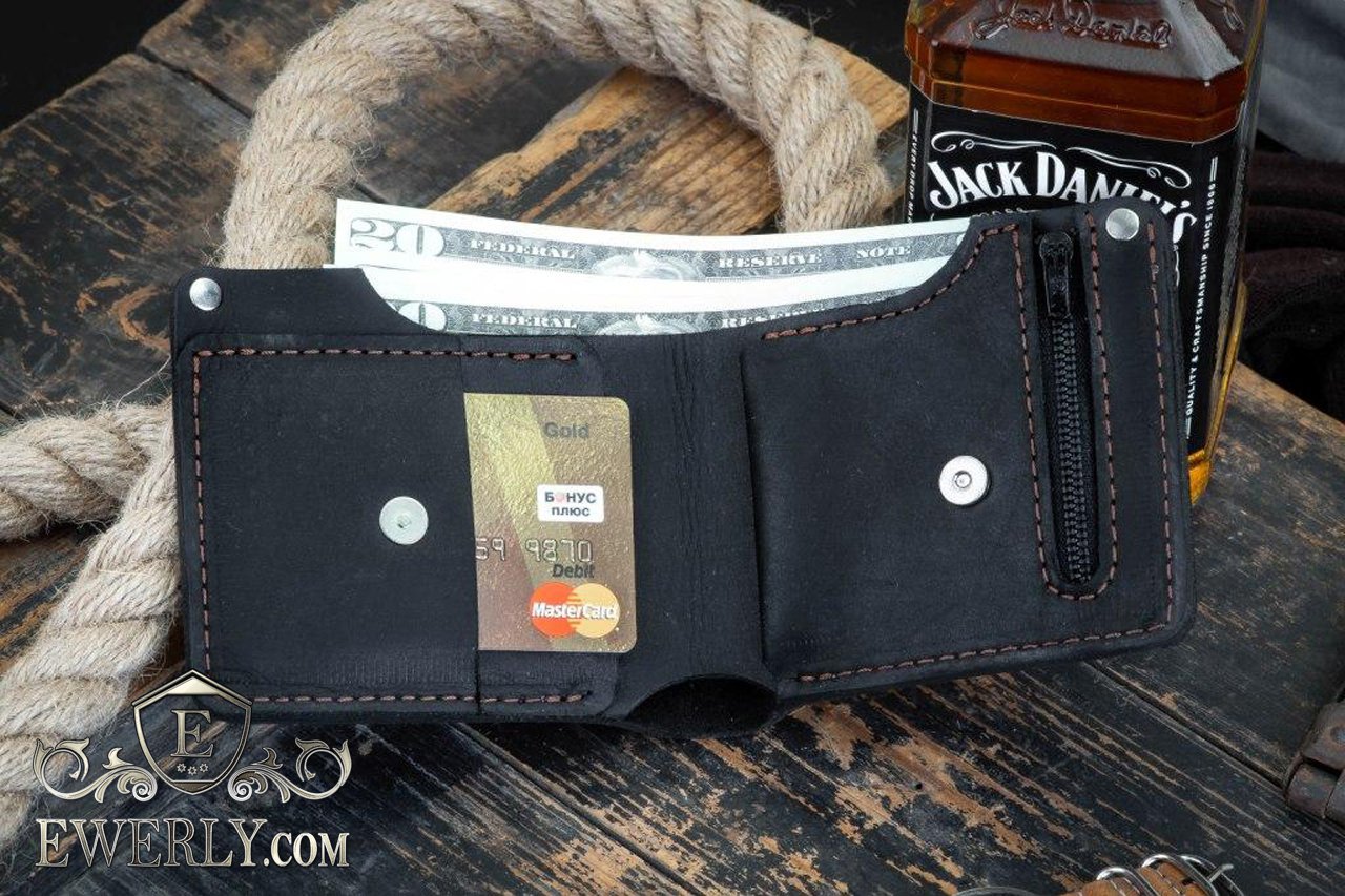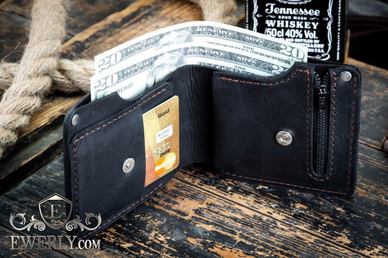 Данная модель кошелька изготовлена из натуральной винтажной кожи чёрного цвета, на которой могут оставаться естественные царапины и потёртости. Любая такая царапина легко затирается рукой. Компактный и является весьма стильным мужским кошельком с интересным дизайном. Имеет один раздел под банковские карты, один раздел с молнией под мелочь, а также один раздел под бумажные деньги купюрами любых номиналов, в том числе самых крупных.