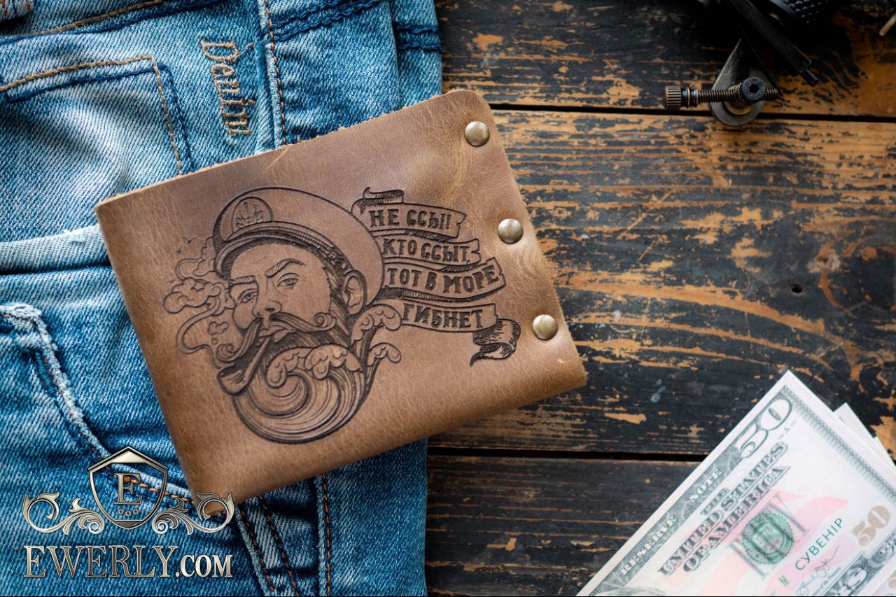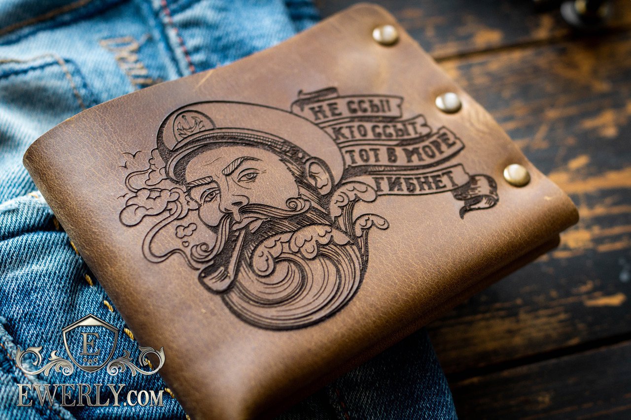 Полностью выполнен из натуральной кожи и металлических заклепок. Эксклюзивное изделие ручной работы, имеет эффект потёртости и лёгкой небрежности. Рисунок нанесён на кожу с помощью лазера (лазерная гравировка). Изготовлен в ограниченном выпуске.