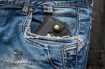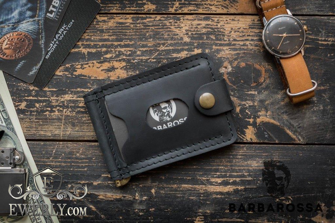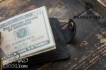 Мужской кожаный зажим для бумажных денег - изделие полностью ручной работы, изготовлен из натуральной кожи чёрного цвета. Имеет три раздела, два внешних из них для банковских карт или визиток и одно внутреннее отделение для купюр всех номиналов, в том числе самых крупных.