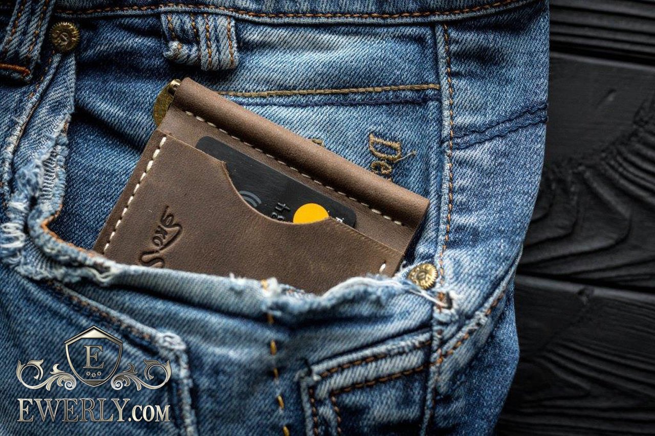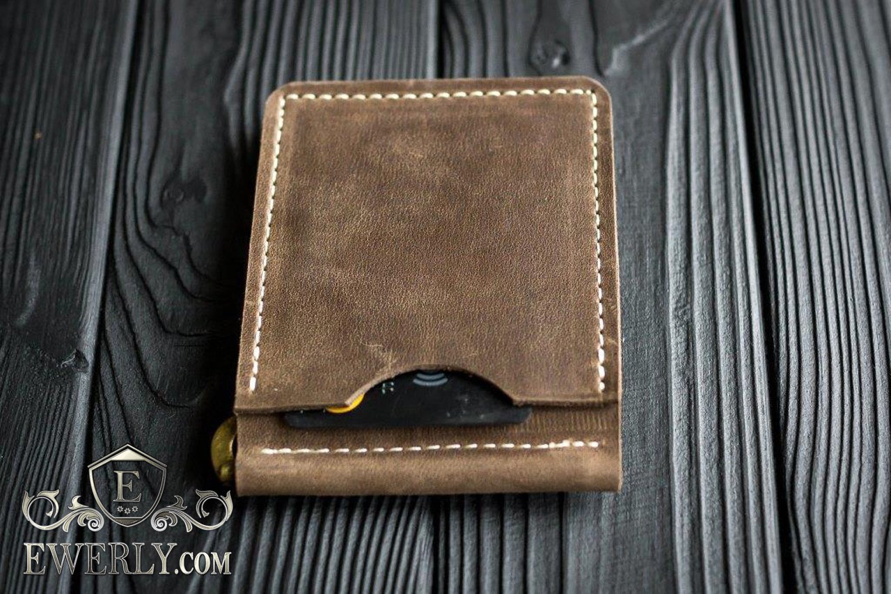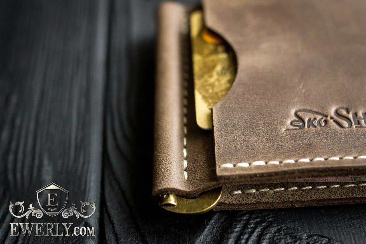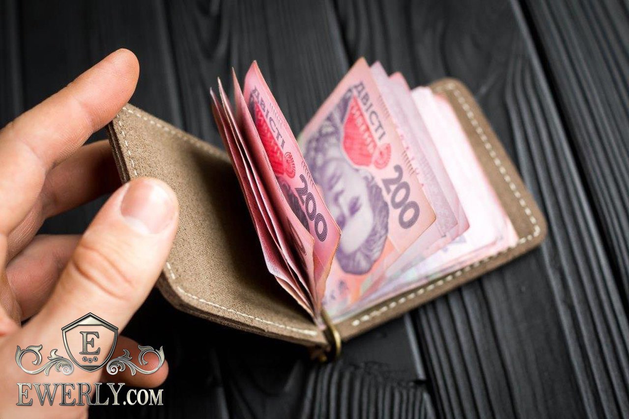 Мужской зажим для бумажных купюр из натуральной кожи с двумя наружными отделениями под банковские карты. Вмещает купюры всех размеров, в том числе самые крупные.