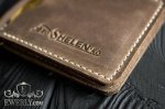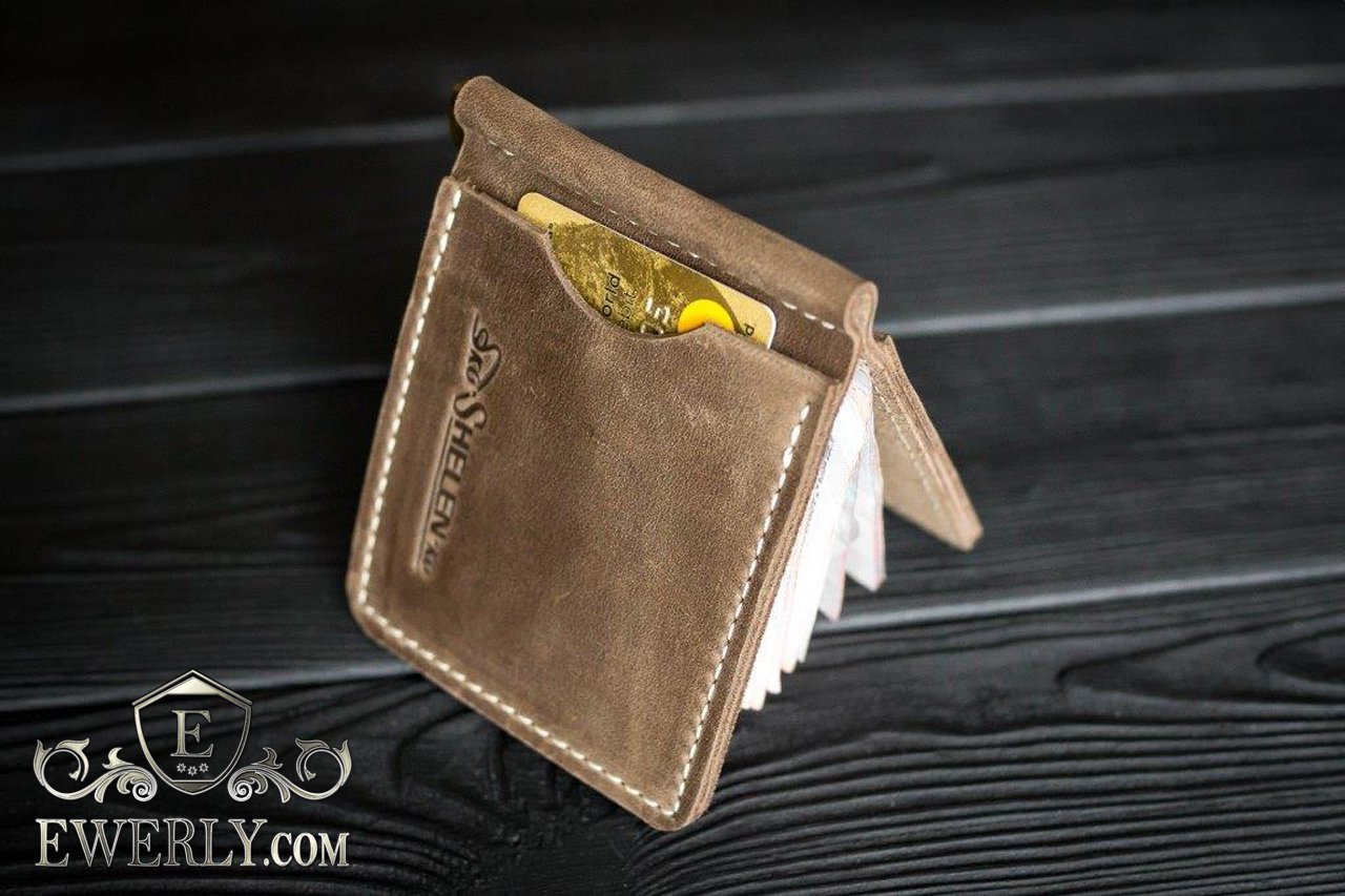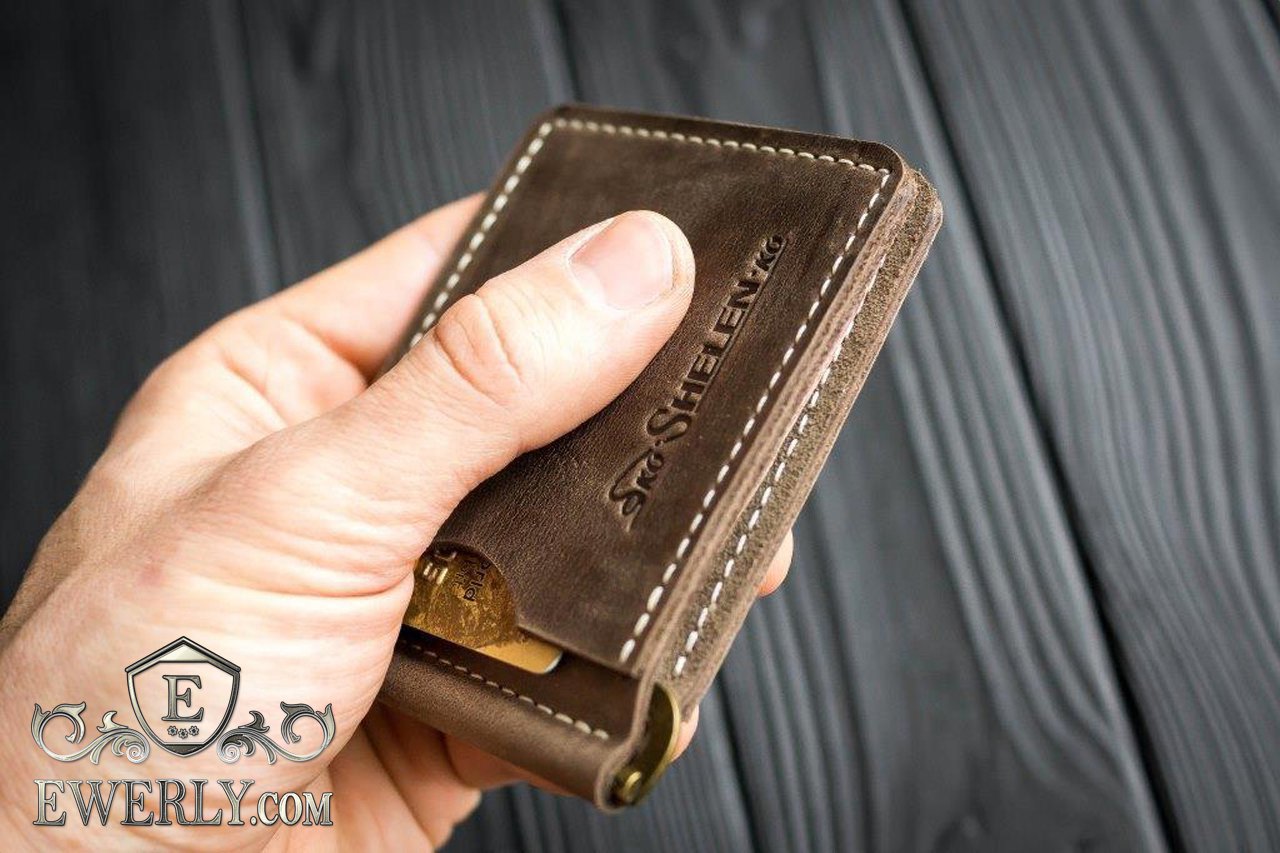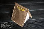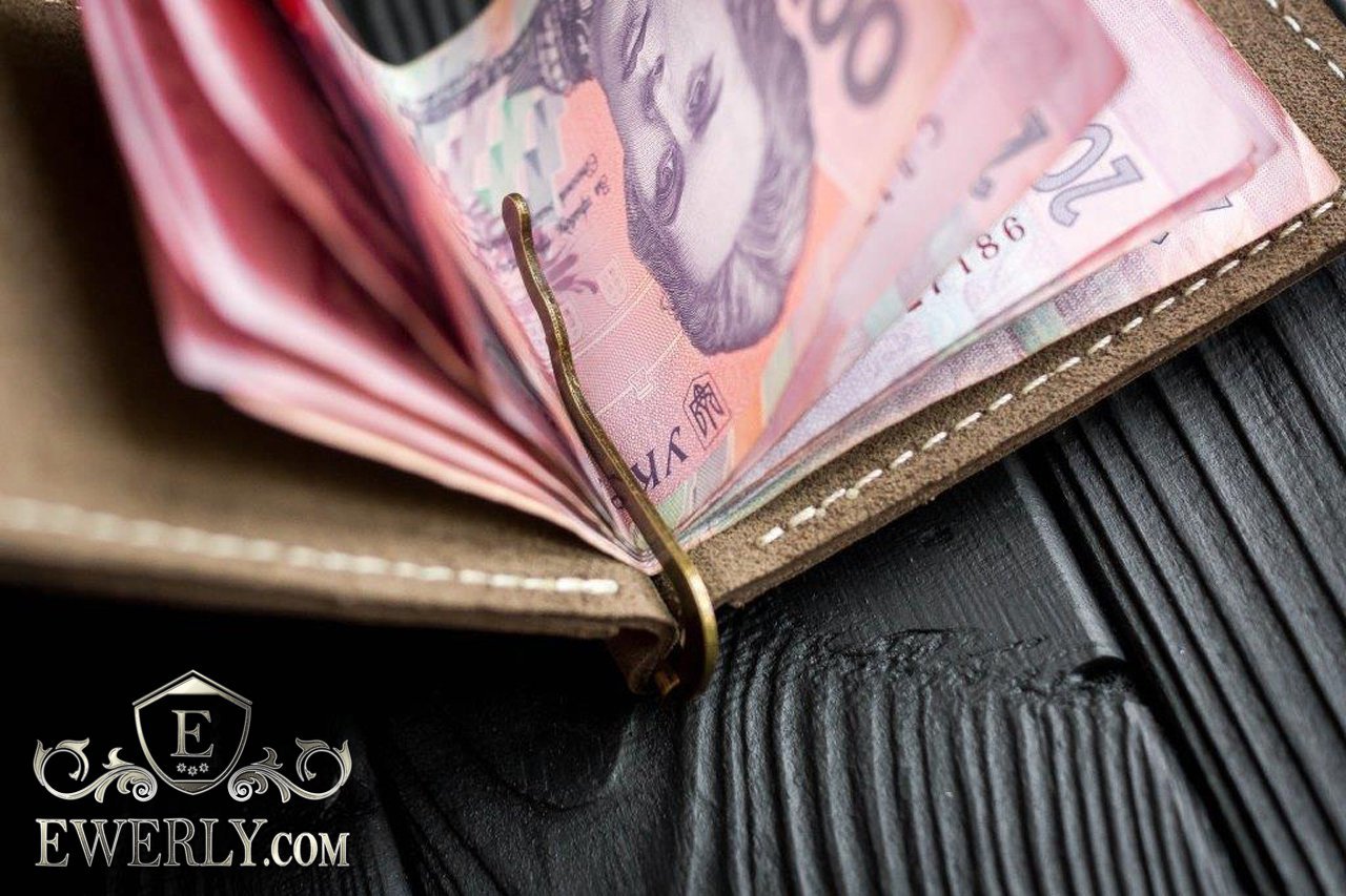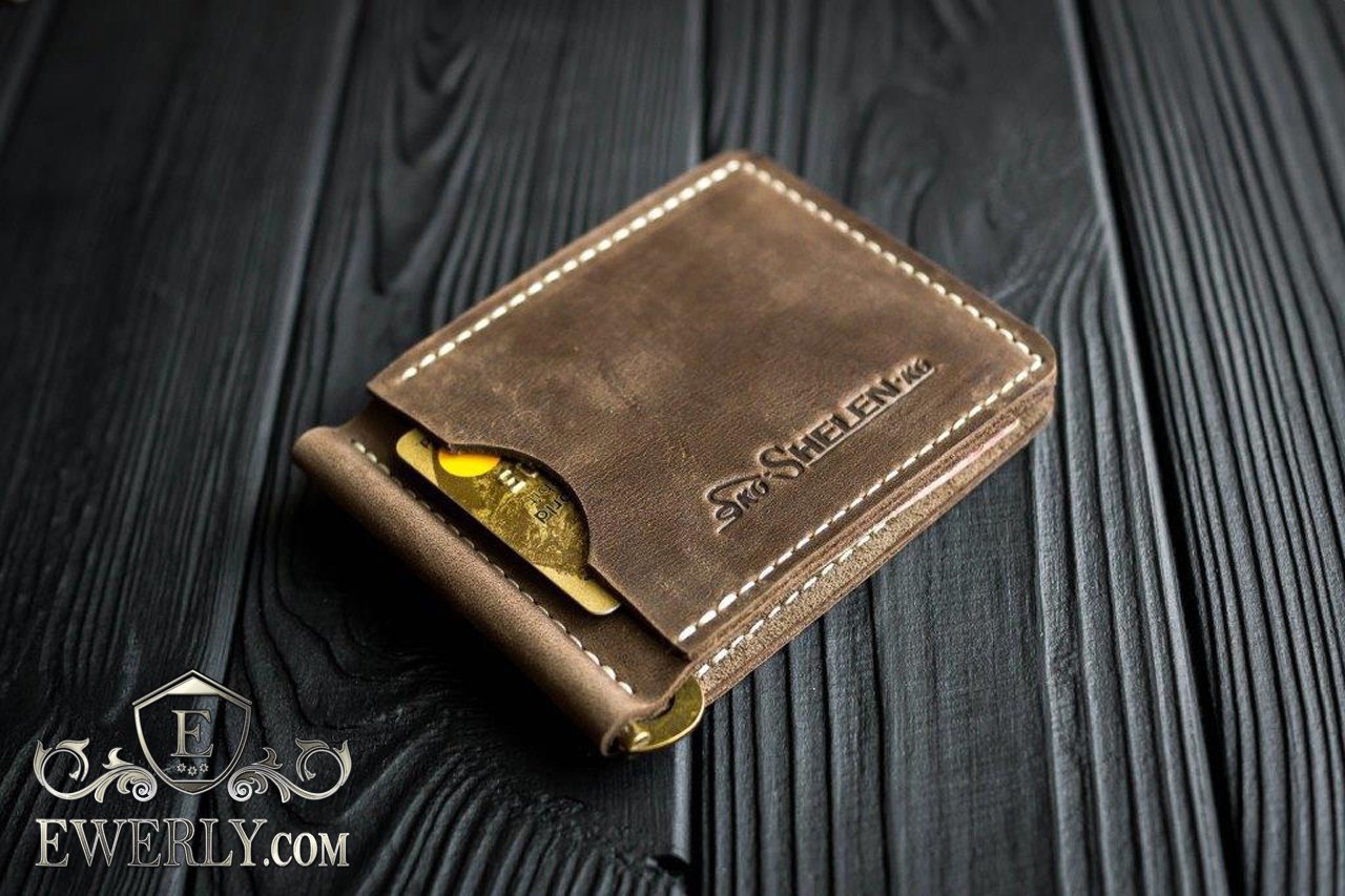 Мужской зажим для бумажных купюр из натуральной кожи с двумя наружными отделениями под банковские карты. Вмещает купюры всех размеров, в том числе самые крупные.
