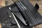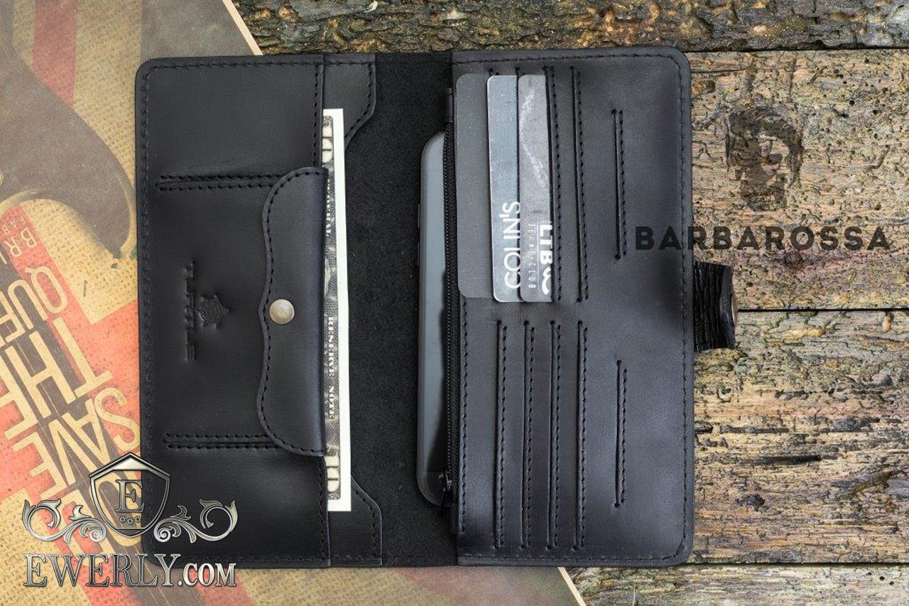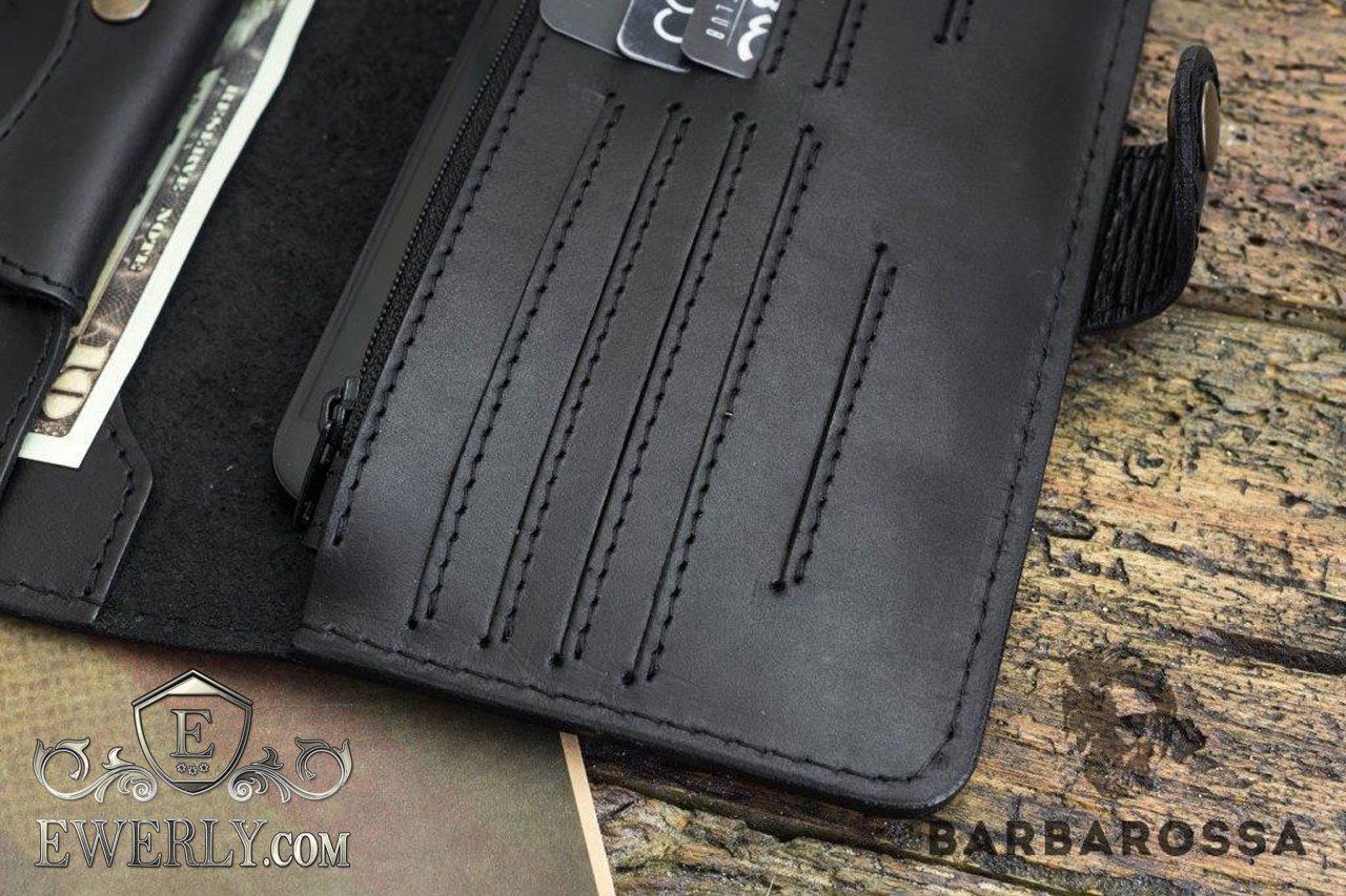 Универсальный мужской кошелёк из натуральной кожи чёрного цвета с множеством отделений: три отделения под денежные купюры, восемь отделений под банковские карты, кармашек под мелочь, отделение для бумаг и документов и большой карман на молнии для хранения хоть даже телефона. Не смотря на всю сложность его выполнения является полностью ручной работой!