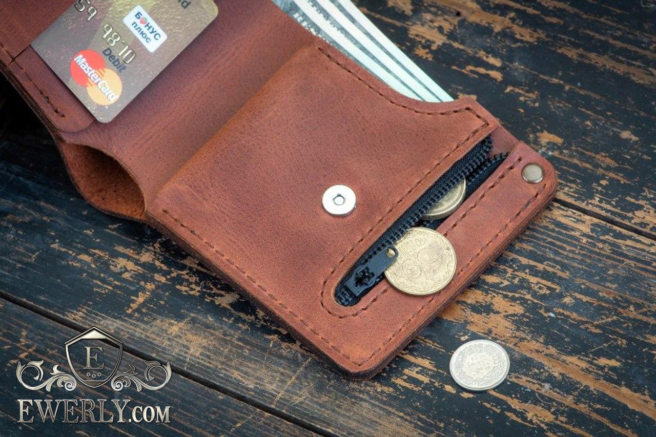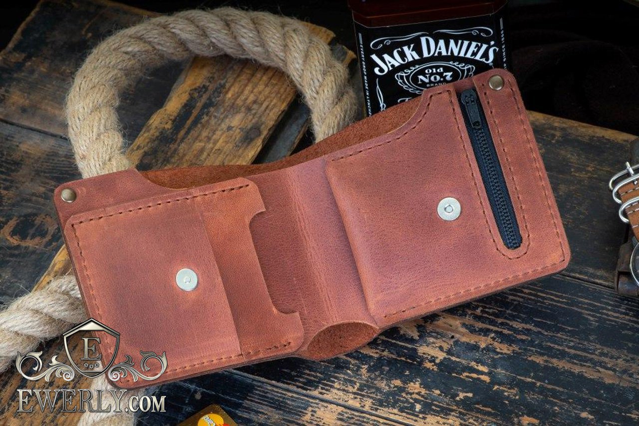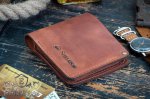 Данная модель кошелька изготовлена из натуральной винтажной кожи коньячного (красно-коричневого) цвета, на которой могут оставаться естественные царапины и потёртости. Любая такая царапина легко затирается рукой. Компактный и является весьма стильным мужским кошельком с интересным дизайном. Имеет один раздел под банковские карты, один раздел с молнией под мелочь, а также один раздел под бумажные деньги купюрами любых номиналов, в том числе самых крупных.