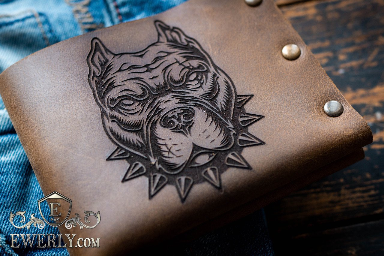 Полностью выполнен из натуральной кожи и металлических заклепок. Эксклюзивное реально мужское портмоне ручной работы с изображением питбуля, имеет эффект потёртости и лёгкой небрежности. Рисунок нанесён на кожу с помощью лазера (лазерная гравировка). Изготовлен в ограниченном выпуске.