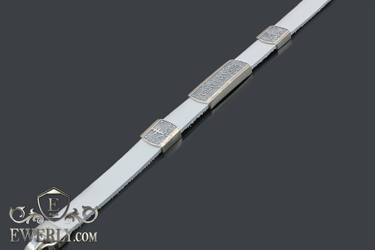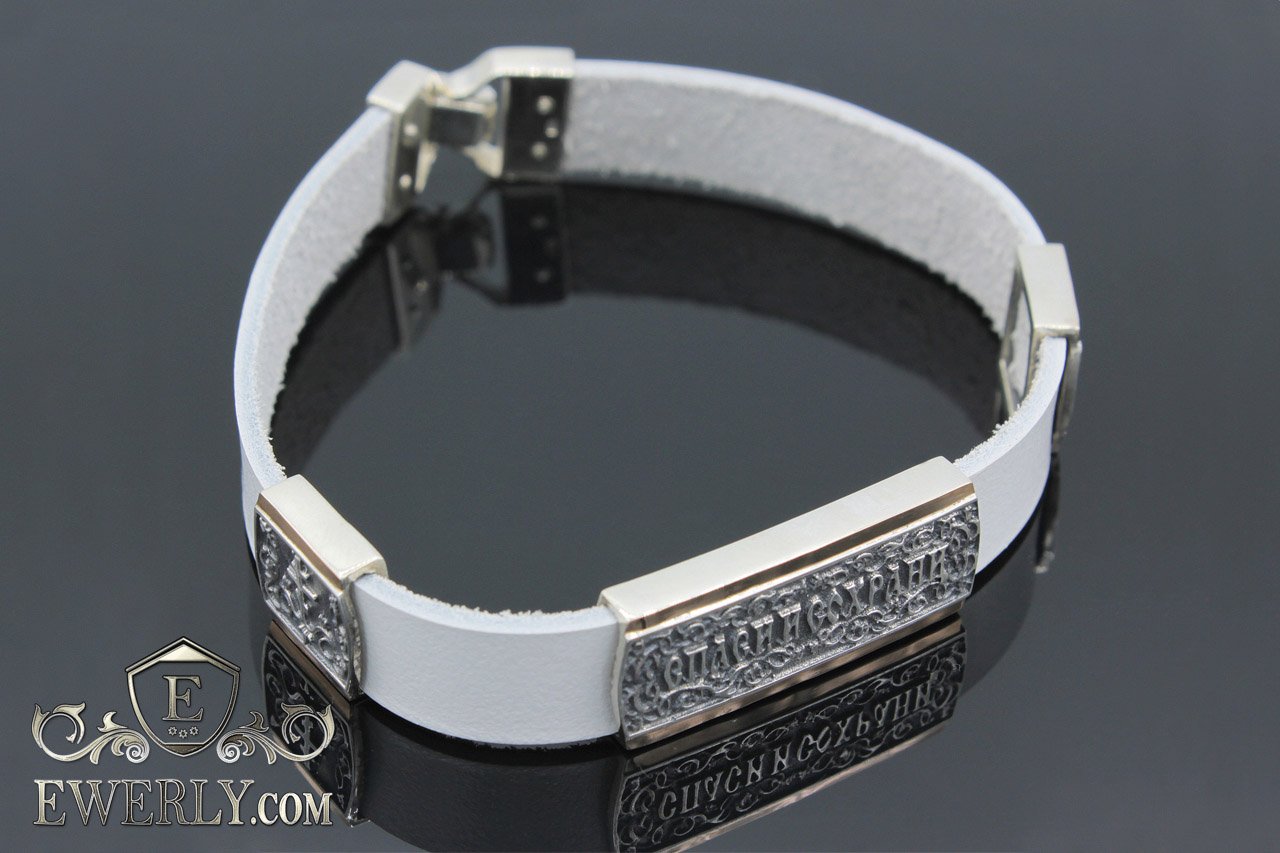 Подойдёт всем. Православный браслет из натуральной белой кожи с серебряным замком и серебряными вставками с надписью "СПАСИ И СОХРАНИ", а также с золотыми вставками.