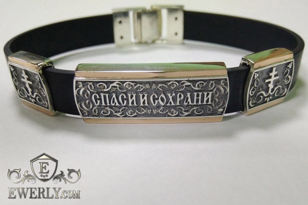 Подойдёт всем. Православный браслет из натуральной чёрной кожи с серебряным замком и серебряными вставками с надписью "СПАСИ И СОХРАНИ", а также с золотыми вставками.