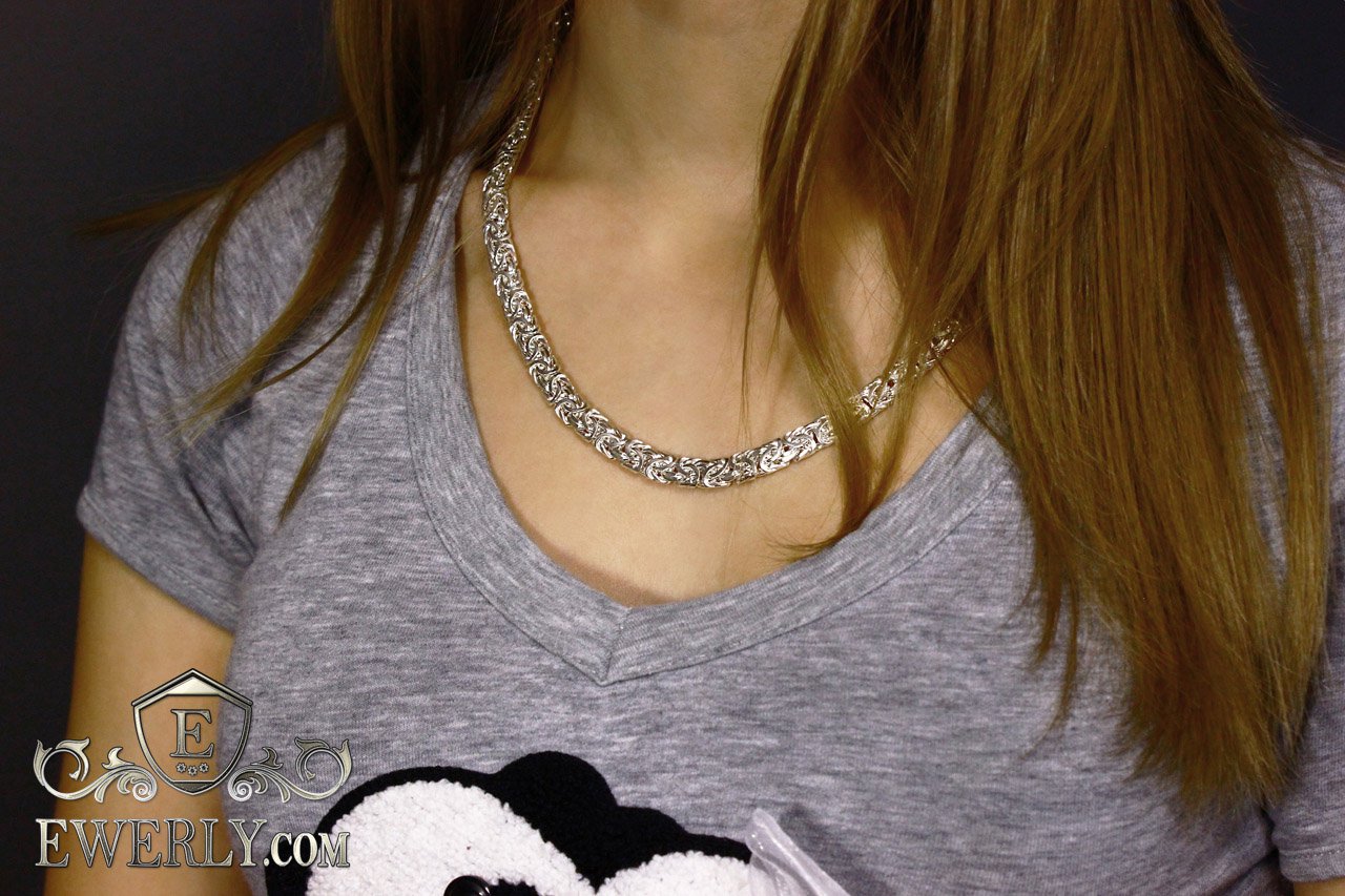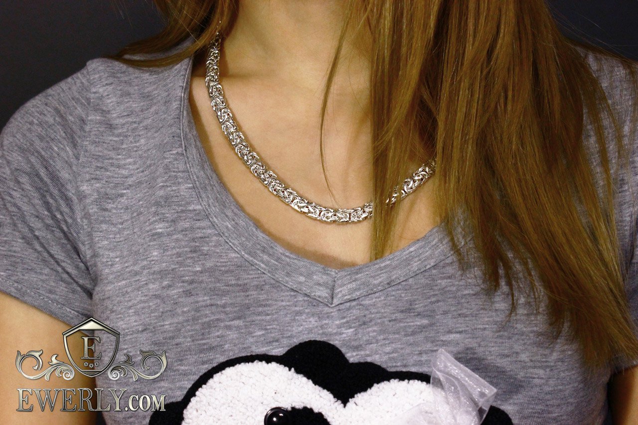 Выбор также варьируется по массе, женщины предпочитают более лёгкие, а мужчины соответственно более тяжёлые и массивные. На фото изображена достаточно массивная и толстая цепочка на шее девушки, некоторые представительницы слабого пола любят и такие цепочки, и они действительно им подходят.