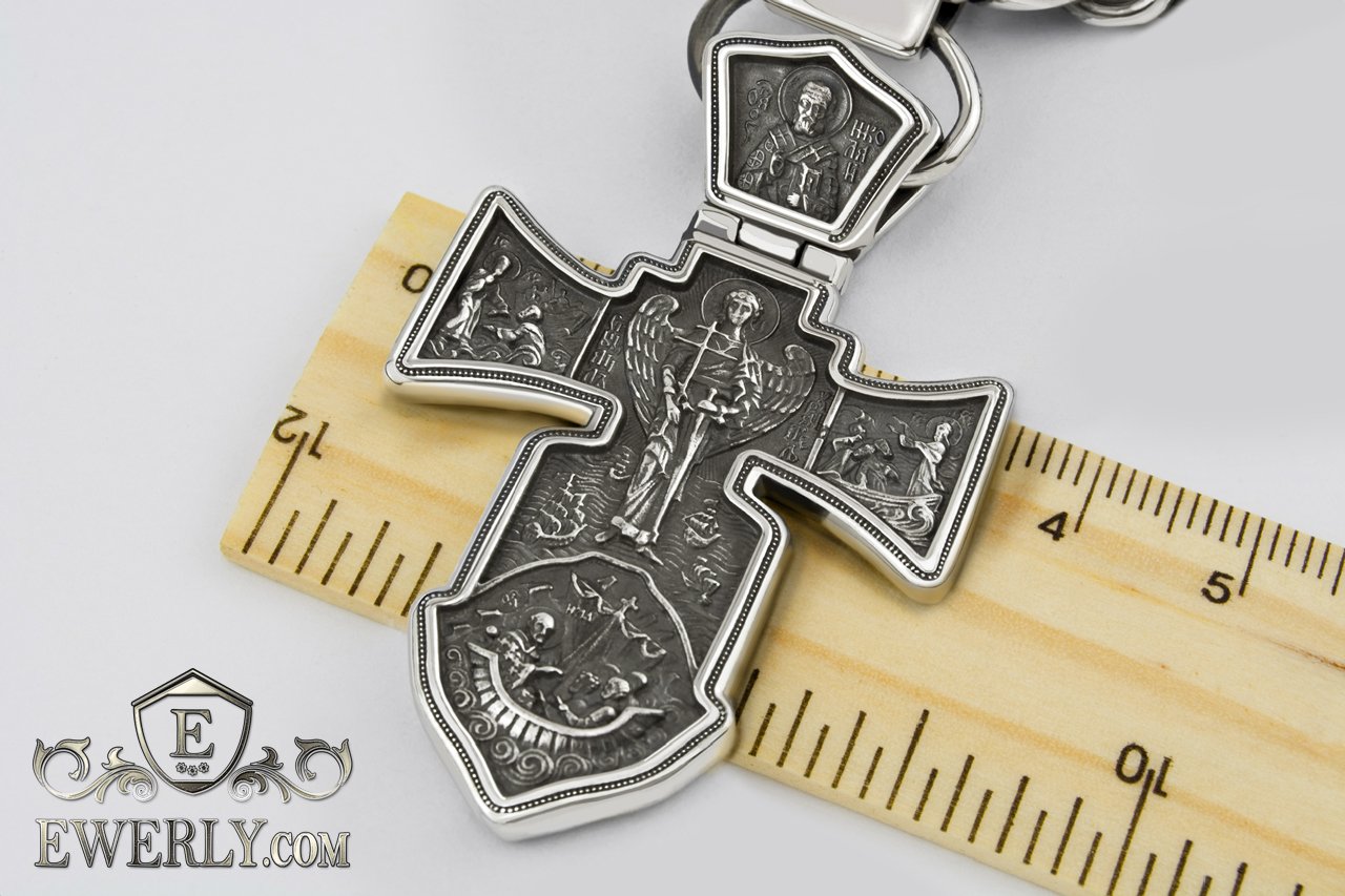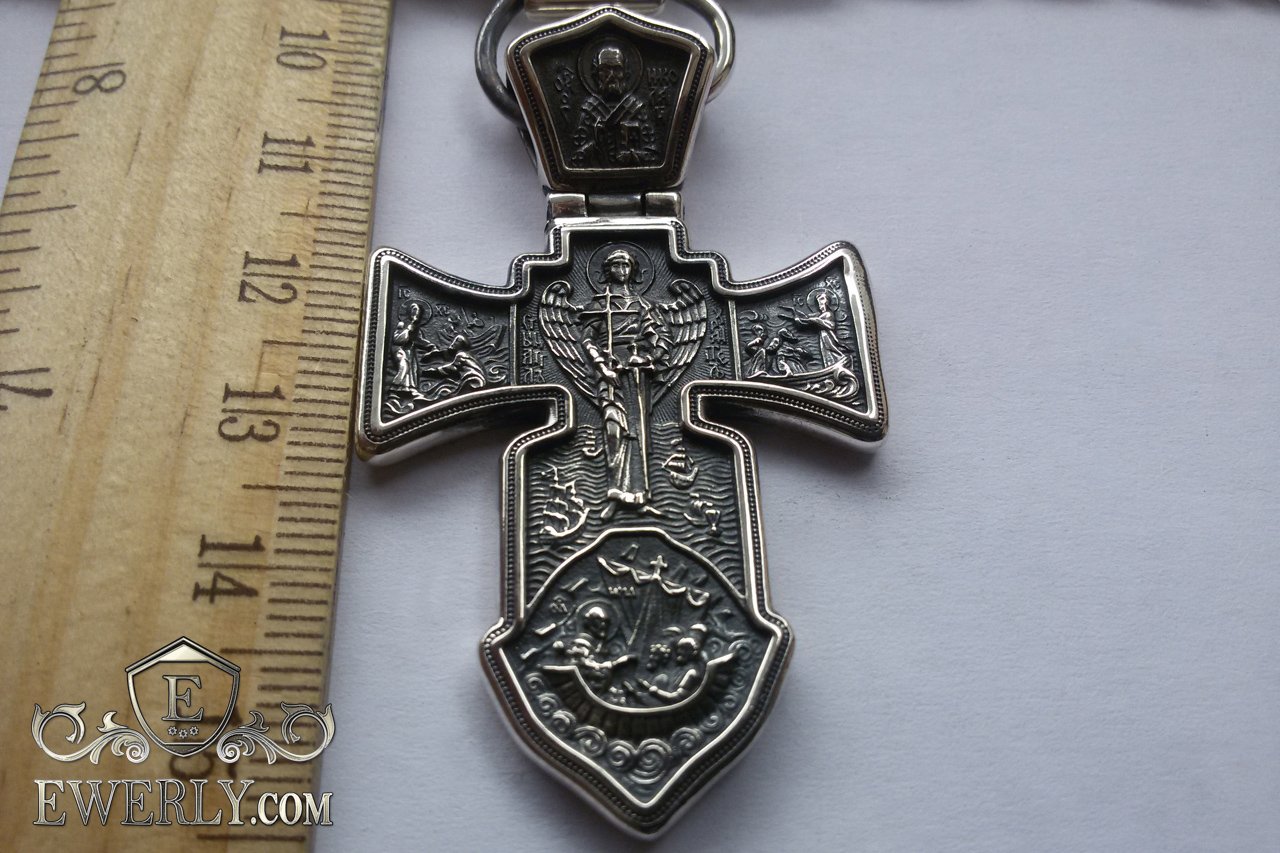 Большой православный крест с распятием мужчине. С обратной стороны креста изображён Ангел Хранитель.Высота: 5.5 мм