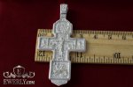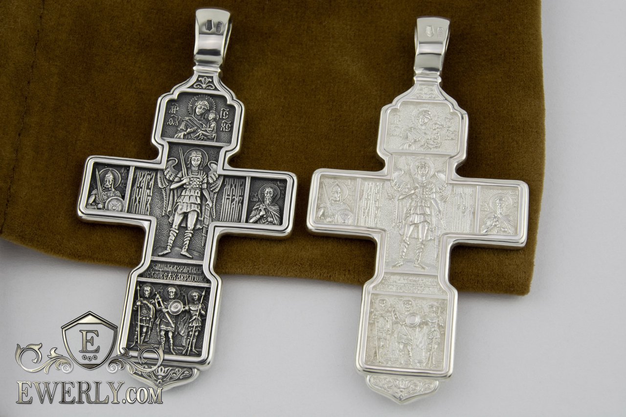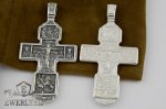 Изображено на кресте: Распятие Христово с предстоящими. Святая Троица. Архангел Михаил. Святые Воины. Тихвинская икона Божией Матери. Православный серебряный крест с чернением.Высота: 8 мм