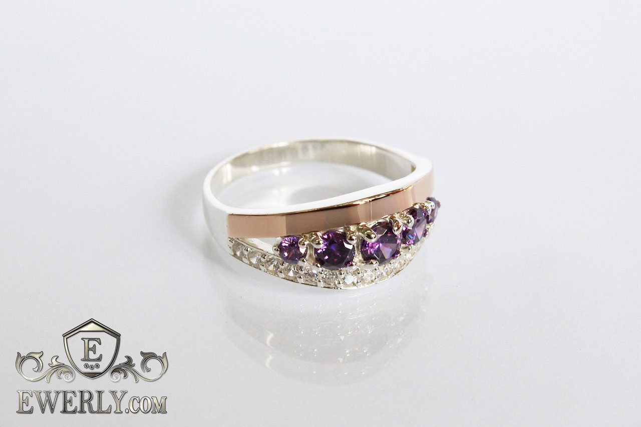 Женское кольцо из серебра 925 пробы с золотой вставкой 375 пробы с камнями аметистового цвета.