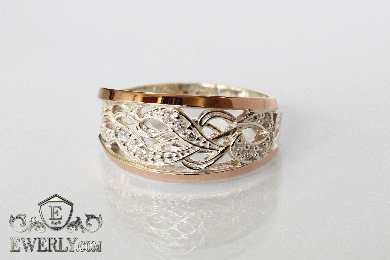 Позолоченное женское серебряное кольцо 925 пробы, позолота 375 пробы с белыми фианитами.