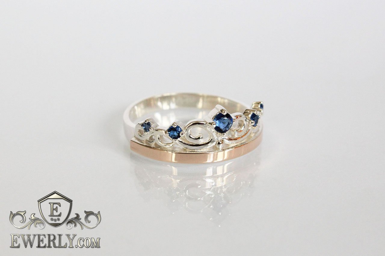 Серебряное кольцо в виде короны с золотом и синими фианитами