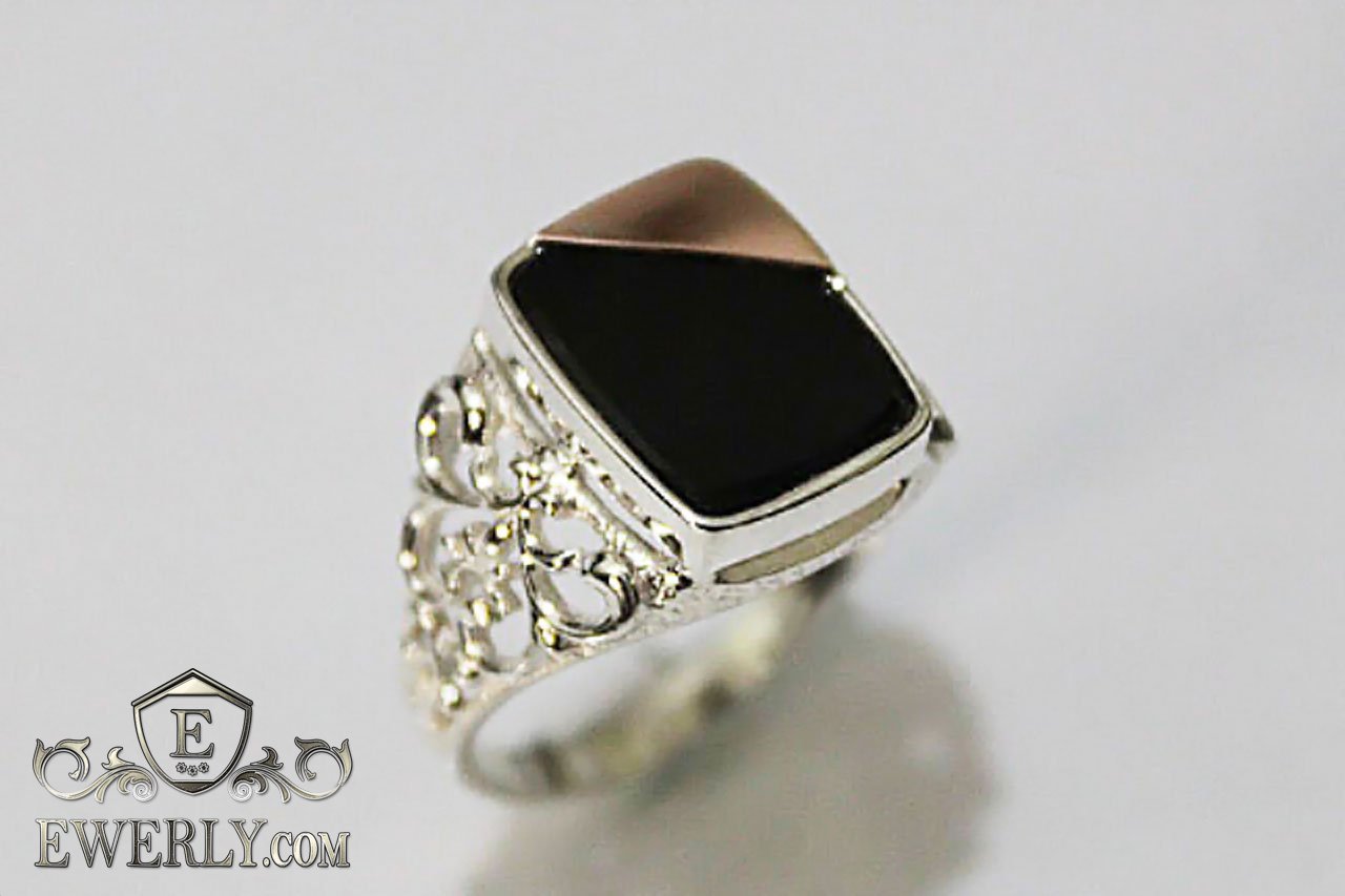 Мужской перстень из серебра 925 пробы с золотом 375 пробы и чёрным камнем, камень Оникс.