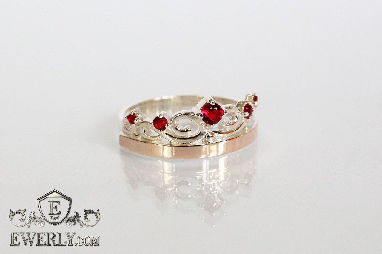 Серебряное кольцо «Корона» с красными камнями (фианитами) и золотой вставкой