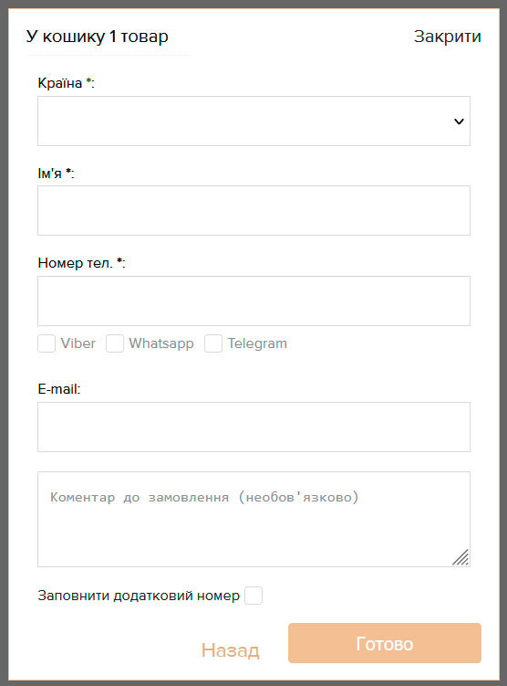 Для оформлення замовлення потрібно заповнити форму: вибрати країну та заповнити два обов'язкові поля "Контактний телефон" та "Ім'я", додаткові поля заповнюються на Ваш розсуд.