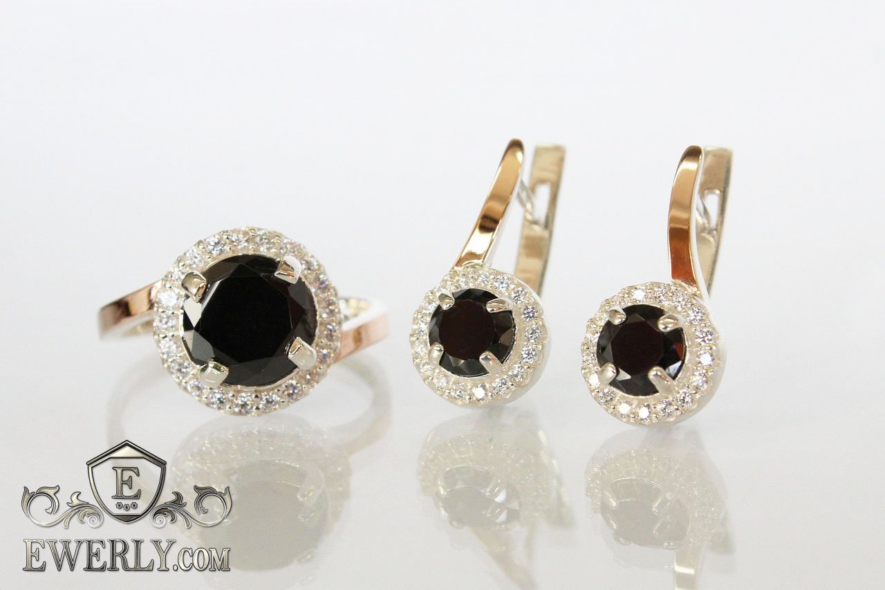 Жіночі срібні кільце і сережки з золотом і чорними фіанітами