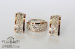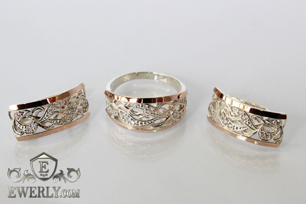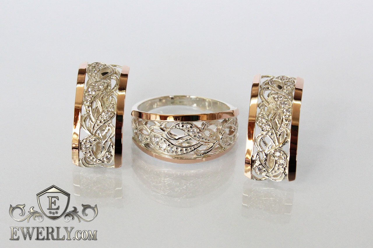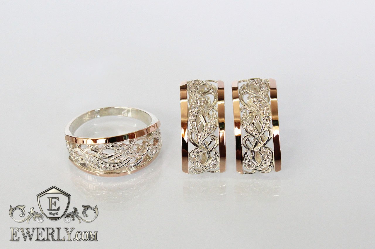 Жіночі срібні сережки і кільце з золотом і білими фіанитами